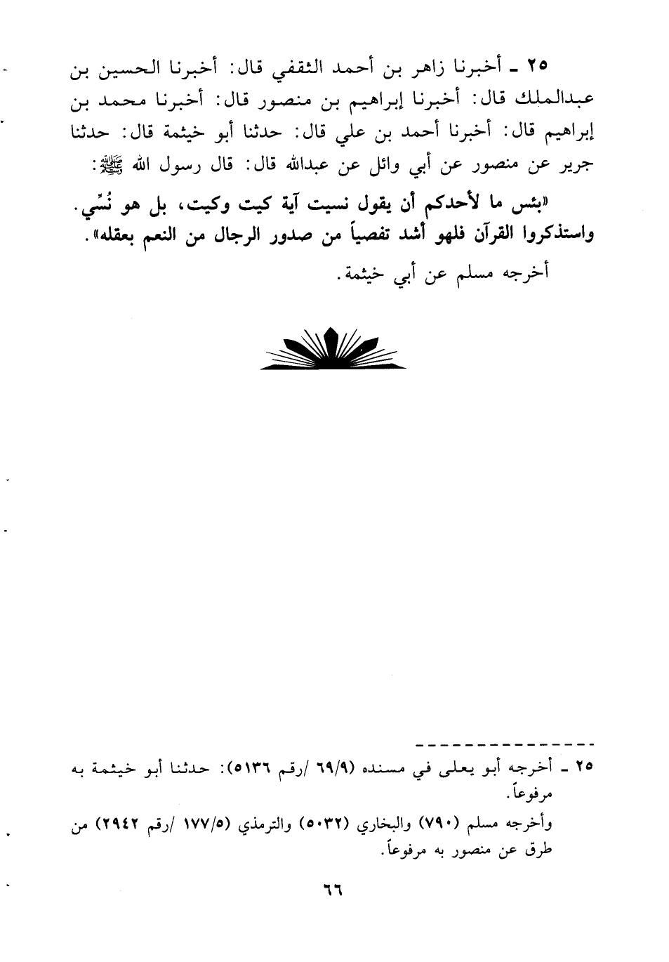 25- أخبرنا زاهر بن أحمد الثقفي قال: أخبرنا الحسين بن عبد الملك قال: أخبرنا إبراهيم بن منصور قال: أخبرنا محمد بن إبراهيم قال: أخبرنا أحمد بن علي قال: حدثنا أبو خيثمة قال: حدثنا جرير عن منصور عن أبي وائل عن عبد الله قال: قال رسول الله صلى الله عليه وسلم: