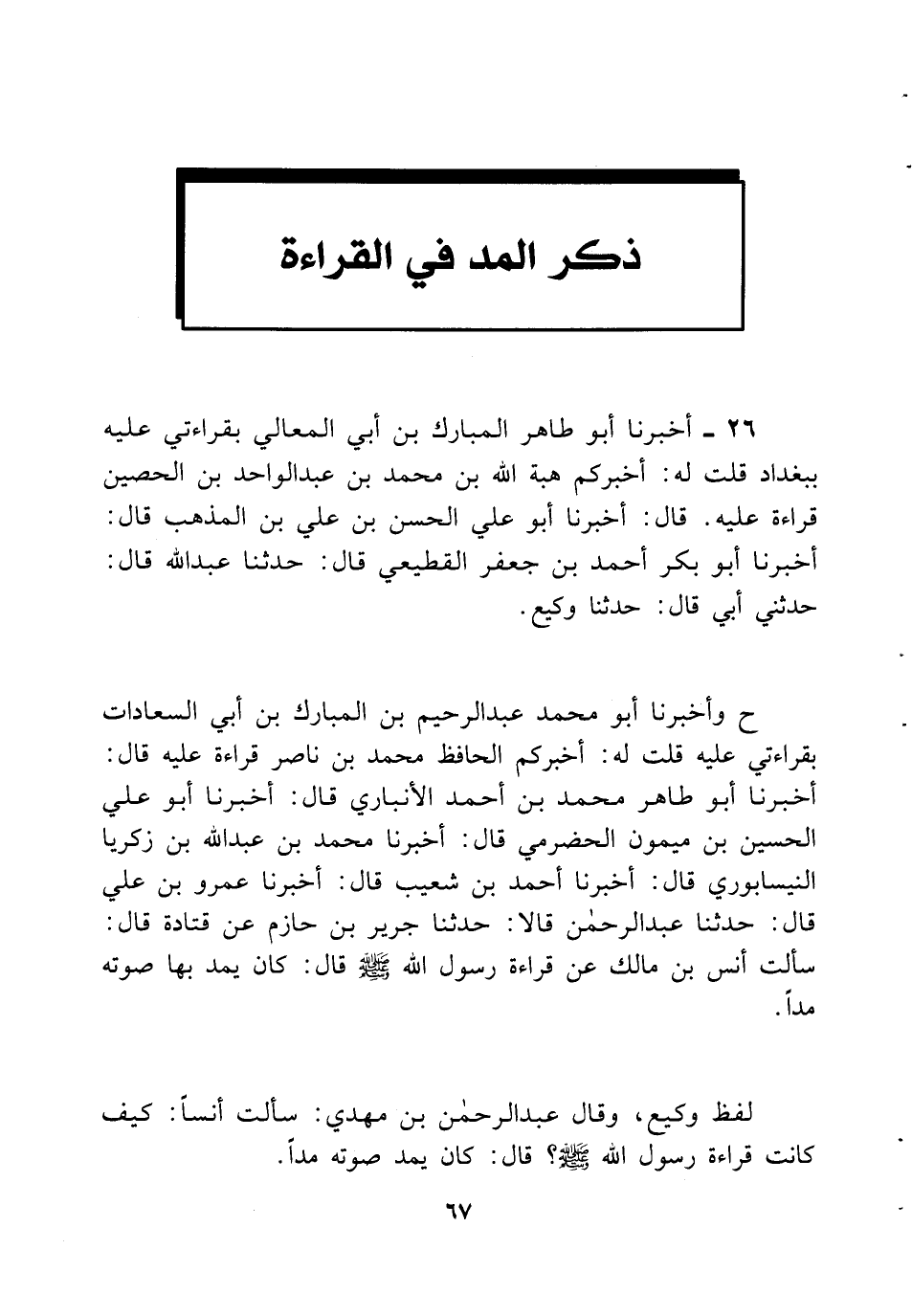 ح وأخبرنا أبو محمد عبد الرحيم بن المبارك بن أبي السعادات بقراءتي عليه قلت له: أخبركم الحافظ محمد بن ناصر قراءة عليه قال: أخبرنا أبو طاهر محمد بن أحمد الأنباري قال: أخبرنا أبو علي الحسين بن ميمون الحضرمي قال: أخبرنا محمد بن عبد الله بن زكريا النيسابوري قال: أخبرنا أحمد بن شعيب قال: أخبرنا عمرو بن علي قال: حدثنا عبد الرحمن قالا: حدثنا جرير بن حازم عن قتادة قال: سألت أنس بن مالك عن قراءة رسول الله صلى الله عليه وسلم قال: كان يمد بها صوته مداً.