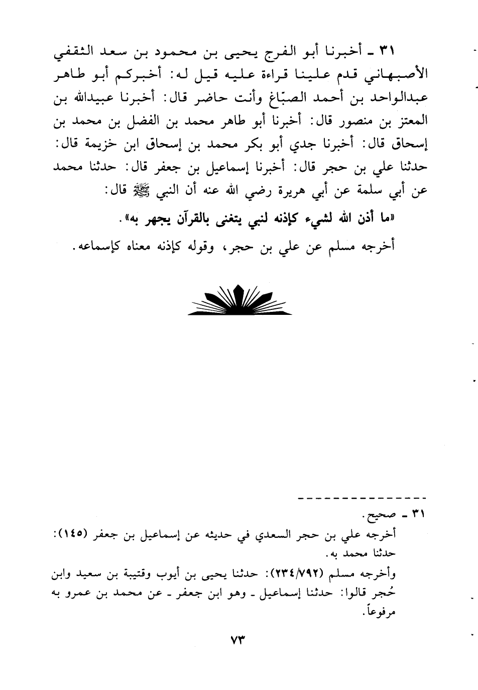 31- أخبرنا أبو الفرج يحيى بن محمود بن سعد الثقفي الأصبهاني قدم علينا قراءة عليه قيل له: أخبركم أبو طاهر عبد الواحد بن أحمد الصباغ وأنت حاضر قال: أخبرنا عبيد الله بن المعتز بن منصور قال: أخبرنا أبو طاهر محمد بن الفضل بن محمد بن إسحاق قال: أخبرنا جدي أبو بكر محمد بن إسحاق بن خزيمة قال: حدثنا علي بن حجر قال: أخبرنا إسماعيل بن جعفر قال: حدثنا محمد عن أبي سلمة عن أبي هريرة رضي الله عنه أن النبي صلى الله عليه وسلم قال: