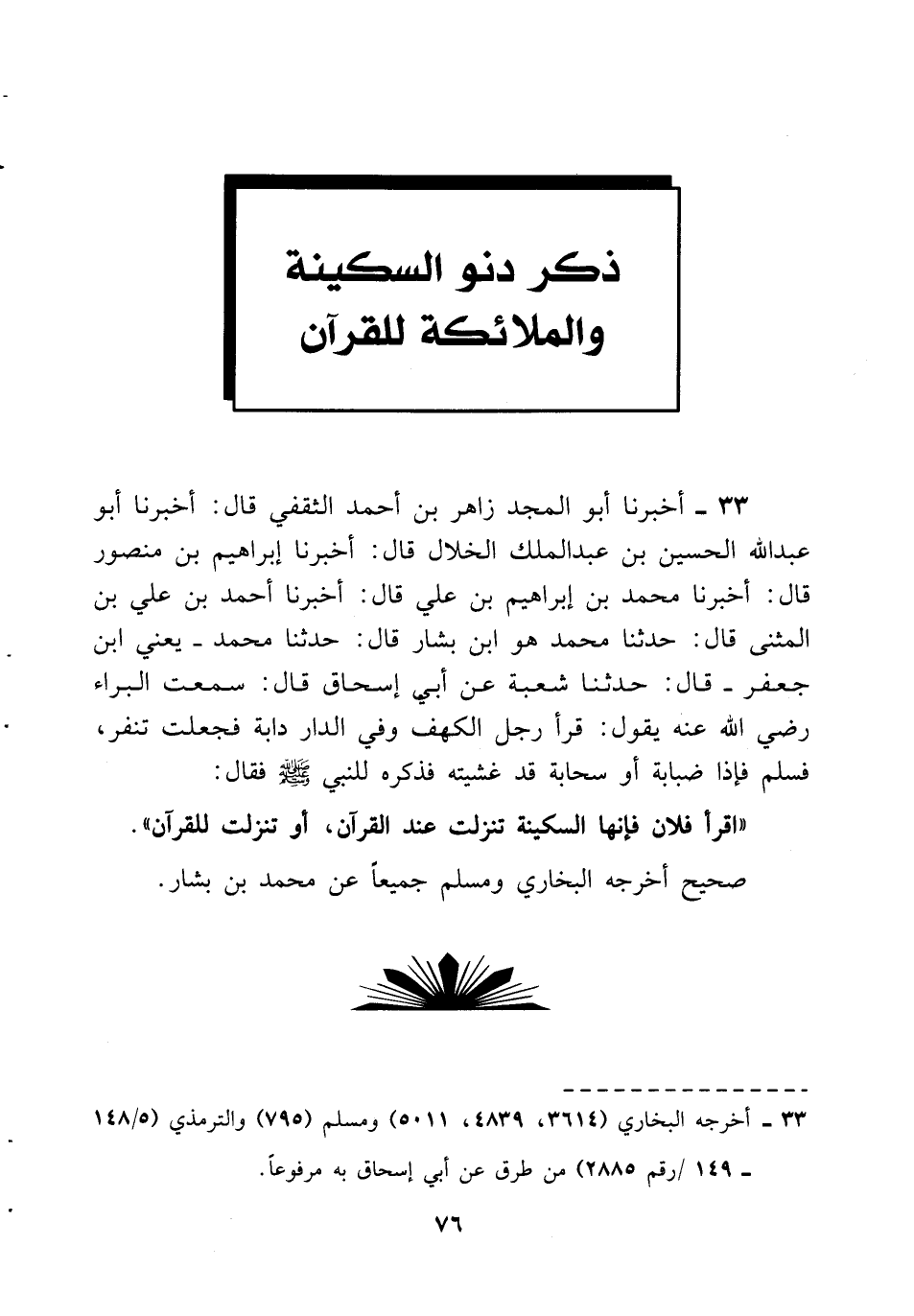 33- أخبرنا أبو المجد زاهر بن أحمد الثقفي قال: أخبرنا أبو عبد الله الحسين بن عبد الملك الخلال قال: أخبرنا إبراهيم بن منصور قال: أخبرنا محمد بن إبراهيم بن علي قال: أخبرنا أحمد بن علي بن المثنى قال: حدثنا محمد هو ابن بشار قال: حدثنا محمد –يعني ابن جعفر- قال: حدثنا شعبة عن أبي إسحاق قال: سمعت البراء رضي الله عنه يقول: قرأ رجل الكهف وفي الدار دابة فجعلت تنفر, فسلم فإذا ضبابة أو سحابة قد غشيته فذكره للنبي صلى الله عليه وسلم فقال: