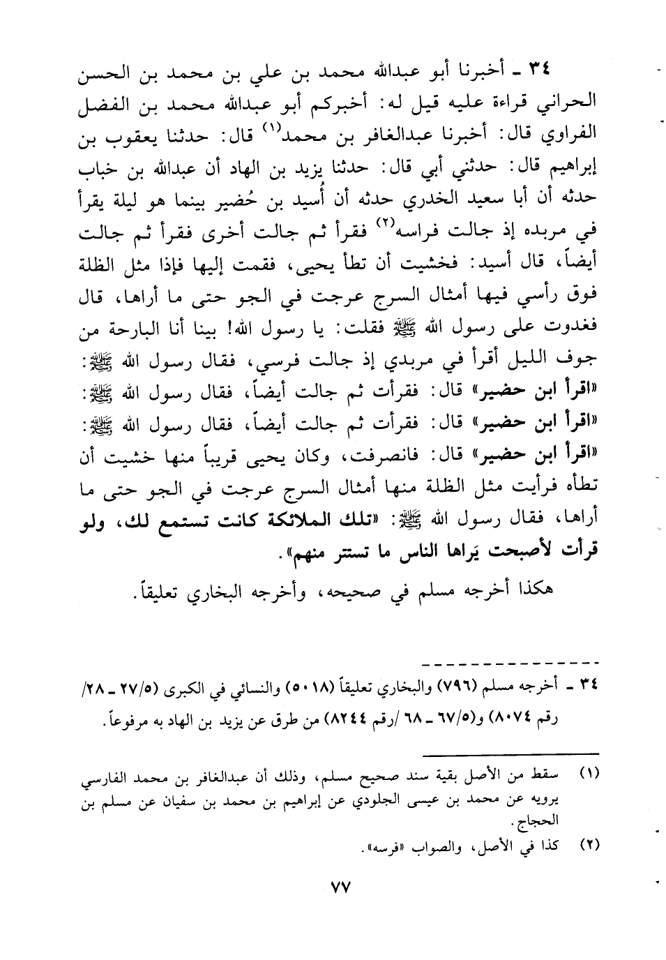 34- أخبرنا أبو عبد الله محمد بن علي بن محمد بن الحسن الحراني قراءة عليه قيل له: أخبركم أبو عبد الله محمد بن الفضل الفراوي قال: أخبرنا عبد الغافر بن محمد قال: حدثنا يعقوب بن إبراهيم قال: حدثني أبي قال: حدثنا يزيد بن الهاد أن عبد الله بن خباب حدثه أن أبا سعيد الخدري حدثه أن أسيد بن حضير بينما هو ليلة يقرأ في مربده إذ جالت فراسه فقرأ ثم جالت أخرى فقرأ ثم جالت أيضاً, قال أسيد: فخشيت أن تطأ يحيى, فقمت إليها فإذا مثل الظلة فوق رأسي فيها أمثال السرج عرجت في الجو حتى ما أراها, قال: فغدوت على رسول الله صلى الله عليه وسلم فقلت: يا رسول الله! بينا أنا البارحة من جوف الليل أقرأ في مربدي إذ جالت فرسي, فقال رسول الله صلى الله عليه وسلم: ((اقرأ ابن حضير)) قال: فقرأت ثم جالت أيضاً, فقال رسول الله صلى الله عليه وسلم: ((اقرأ ابن حضير)) قال: فقرأت ثم جالت أيضاً, فقال رسول الله صلى الله عليه وسلم: ((اقرأ ابن حضير)) قال: فانصرفت, وكان يحيى قريباً منها خشيت أن تطأه فرأيت مثل الظلة منها أمثال السرج عرجت في الجو حتى ما أراها, فقال رسول الله صلى الله عليه وسلم: ((تلك الملائكة كانت تستمع لك, ولو قرأت لأصبحت يراها الناس ما تستر منهم)) .