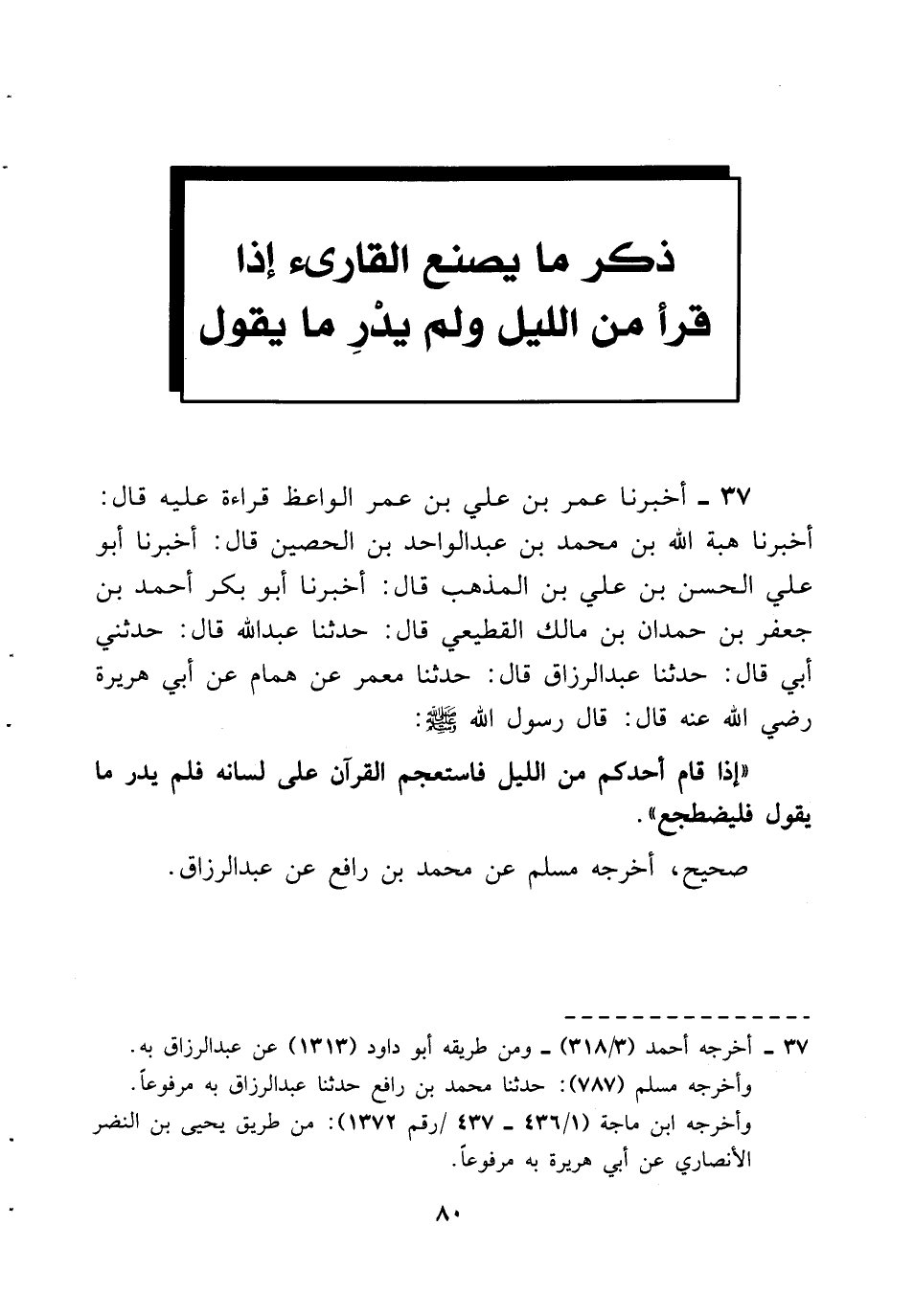 37- أخبرنا عمر بن علي بن عمر الواعظ قراءة عليه قال: أخبرنا هبة الله بن محمد بن عبد الواحد بن الحصين قال: أخبرنا أبو علي الحسن بن علي بن المذهب قال: أخبرنا أبو بكر أحمد بن جعفر بن حمدان بن مالك القطيعي قال: حدثنا عبد الله قال: حدثني أبي قال: حدثنا عبد الرزاق قال: حدثنا معمر عن همام عن أبي هريرة رضي الله عنه قال: قال رسول الله صلى الله عليه وسلم: