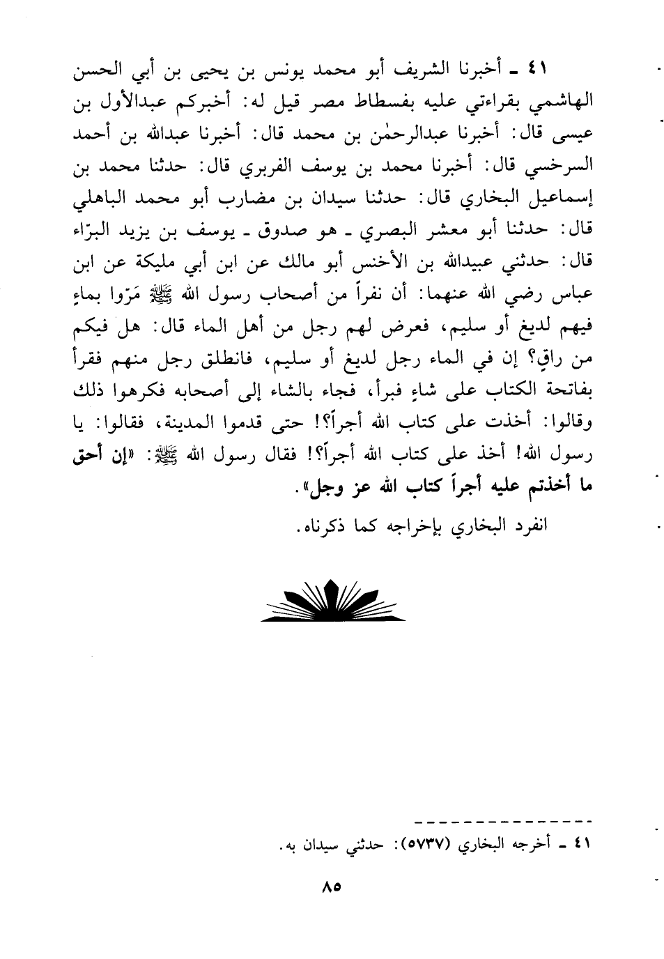 41- أخبرنا الشريف أبو محمد يونس بن يحيى بن أبي الحسن الهاشمي بقراءتي عليه بفسطاط مصر قيل له: أخبركم عبد الأول بن عيسى قال: أخبرنا عبد الرحمن بن محمد قال: أخبرنا عبد الله بن أحمد السرخسي قال: أخبرنا محمد بن يوسف الفربري قال: حدثنا محمد بن إسماعيل البخاري قال: حدثنا سيدان بن مضارب أبو محمد الباهلي قال: حدثنا أبو معشر البصري –هو صدوق- يوسف بن يزيد البراء قال: حدثني عبيد الله بن الأخنس أبو مالك عن ابن أبي مليكة عن ابن عباس رضي الله عنهما: أن نفراً من أصحاب رسول الله صلى الله عليه وسلم مروا بماء فيهم لديغ أو سليم، فعرض لهم رجل من أهل الماء قال: هل فيكم من راق؟ إن في الماء رجل لديغ أو سليم، فانطلق رجل منهم فقرأ بفاتحة الكتاب على شاء فبرأ، فجاء بالشاء إلى أصحابه فكرهوا ذلك وقالوا: أخذت على كتاب الله أجراً؟! حتى قدموا المدينة، فقالوا: يا رسول الله! أخذ على كتاب الله أجراً؟! فقال رسول الله صلى الله عليه وسلم: ((إن أحق ما أخذتم عليه أجراً كتاب الله عز وجل)) .