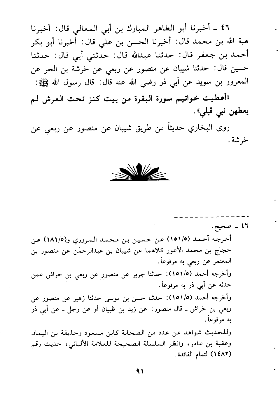46- أخبرنا أبو الطاهر المبارك بن أبي المعالي قال: أخبرنا هبة الله بن محمد قال: أخبرنا الحسن بن علي قال: أخبرنا أبو بكر أحمد بن جعفر قال: حدثنا عبد الله قال: حدثني أبي قال: حدثنا حسين قال: حدثنا شيبان عن منصور عن ربعي عن خرشة بن الحر عن المعرور بن سويد عن أبي ذر رضي الله عنه قال: قال رسول الله صلى الله عليه وسلم: