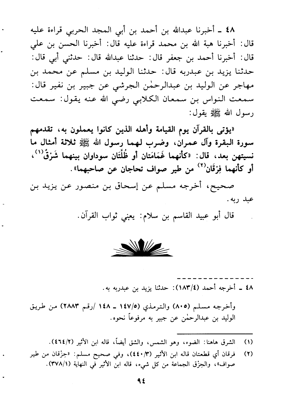 48- أخبرنا عبد الله بن أحمد بن أبي المجد الحربي قراءة عليه قال: أخبرنا هبة الله بن محمد قراءة عليه قال: أخبرنا الحسن بن علي قال: أخبرنا أحمد بن جعفر قال: حدثنا عبد الله قال: حدثني أبي قال: حدثنا يزيد بن عبد ربه قال: حدثنا الوليد بن مسلم عن محمد بن مهاجر عن الوليد بن عبد الرحمن الجرشي عن جبير بن نفير قال: سمعت النواس بن سمعان الكلابي رضي الله عنه يقول: سمعت رسول الله صلى الله عليه وسلم يقول: