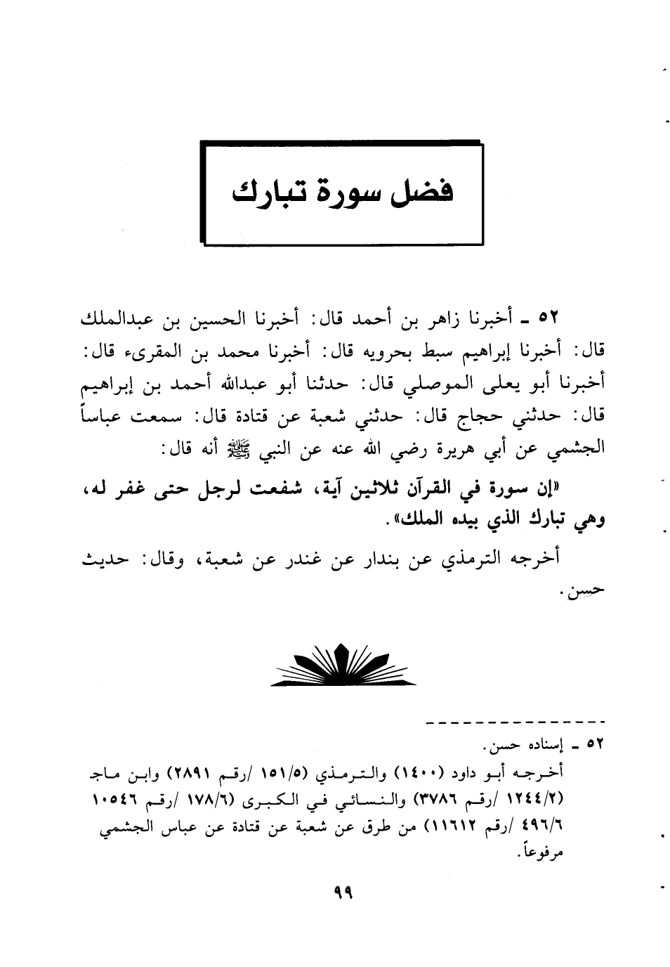 52- أخبرنا زاهر بن أحمد قال: أخبرنا الحسين بن عبد الملك قال: أخبرنا إبراهيم سبط بحرويه قال: أخبرنا محمد بن المقرئ قال: أخبرنا أبو يعلى الموصلي قال: حدثنا أبو عبد الله أحمد بن إبراهيم قال: حدثني حجاج قال: حدثني شعبة عن قتادة قال: سمعت عباساً الجشمي عن أبي هريرة رضي الله عنه عن النبي صلى الله عليه وسلم أنه قال: