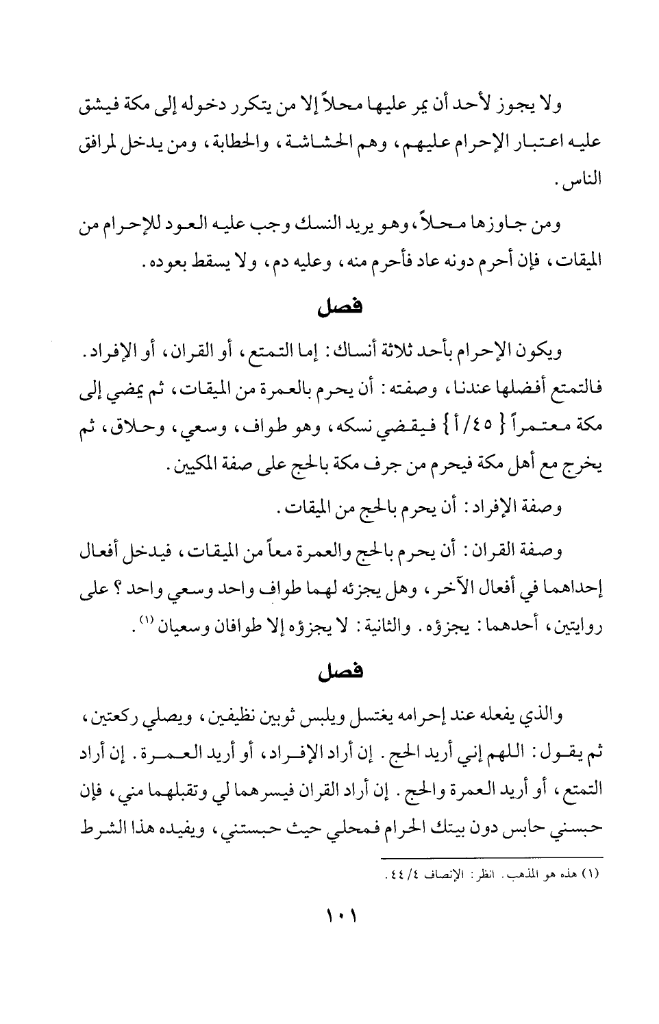 ويكون الإحرام بأحد ثلاثة أنساك: إما التمتع، أو القران، أو الإفراد. فالتمتع أفضلها عندنا، وصفته: أن يحرم بالعمرة من الميقات، ثم يمضي إلى مكة معتمراً {45/أ} فيقضي نسكه، وهو طواف، وسعي، وحلاق، ثم يخرج مع أهل مكة فيحرم من جرف مكة بالحج على صفة المكيين.