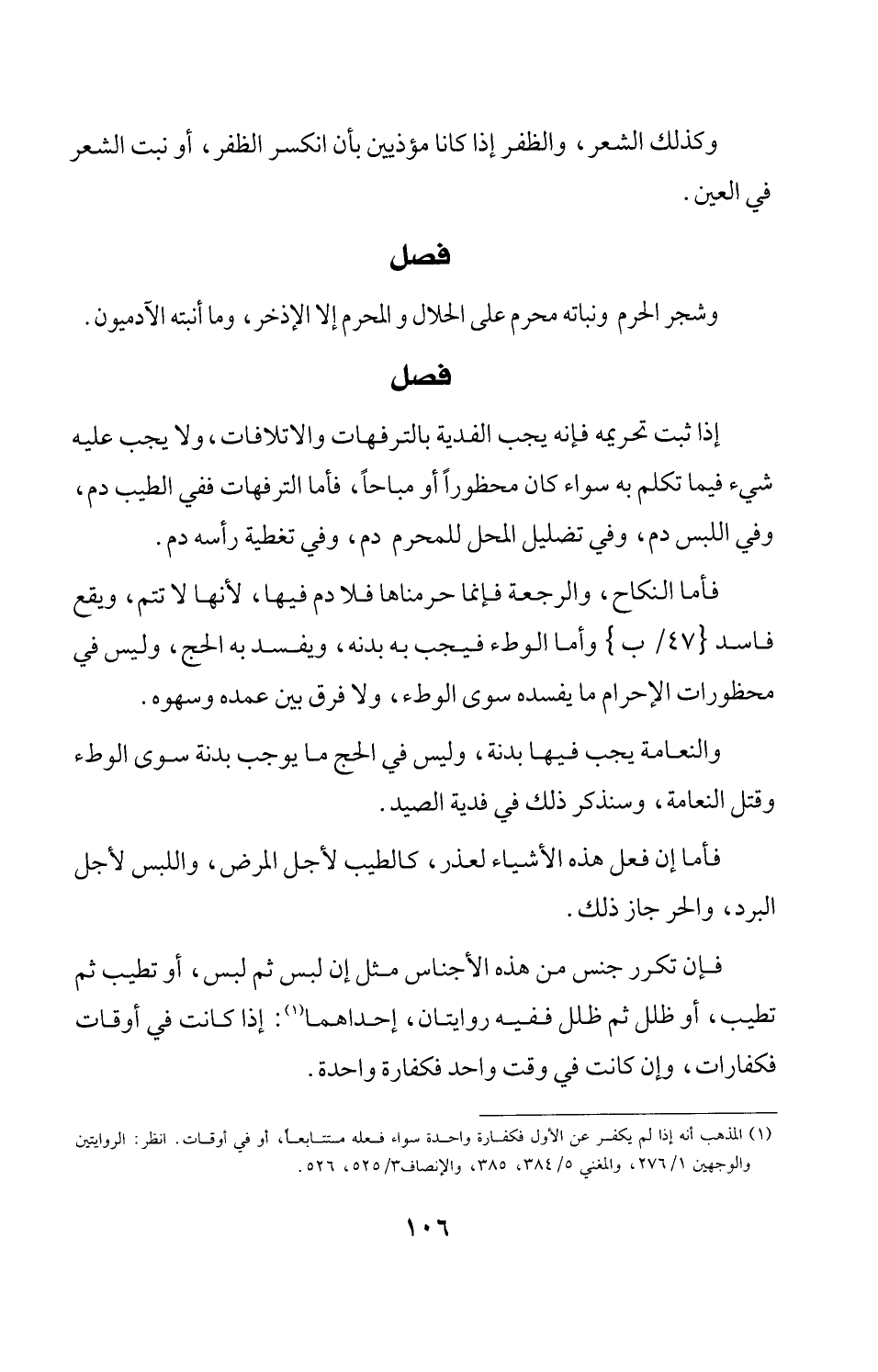 إذا ثبت تحريمه فإنه يجب الفدية بالترفهات والاتلافات، ولا يجب عليه شيء فيما تكلم به سواء كان محظوراً أو مباحاً، فأما الترفهات ففي الطيب دم، وفي اللبس دم، وفي تضليل المحل للمحرم دم، وفي تغطية رأسه دم.