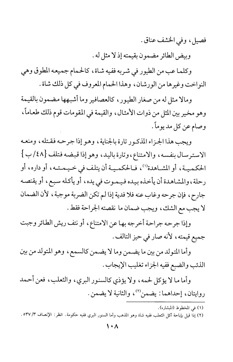 (¬2) إذا قيل بإباحة أكل الثعلب ففيه شاة وهو المذهب وأما السنور البري ففيه حكومة. انظر: الإنصاف 3/ 537.