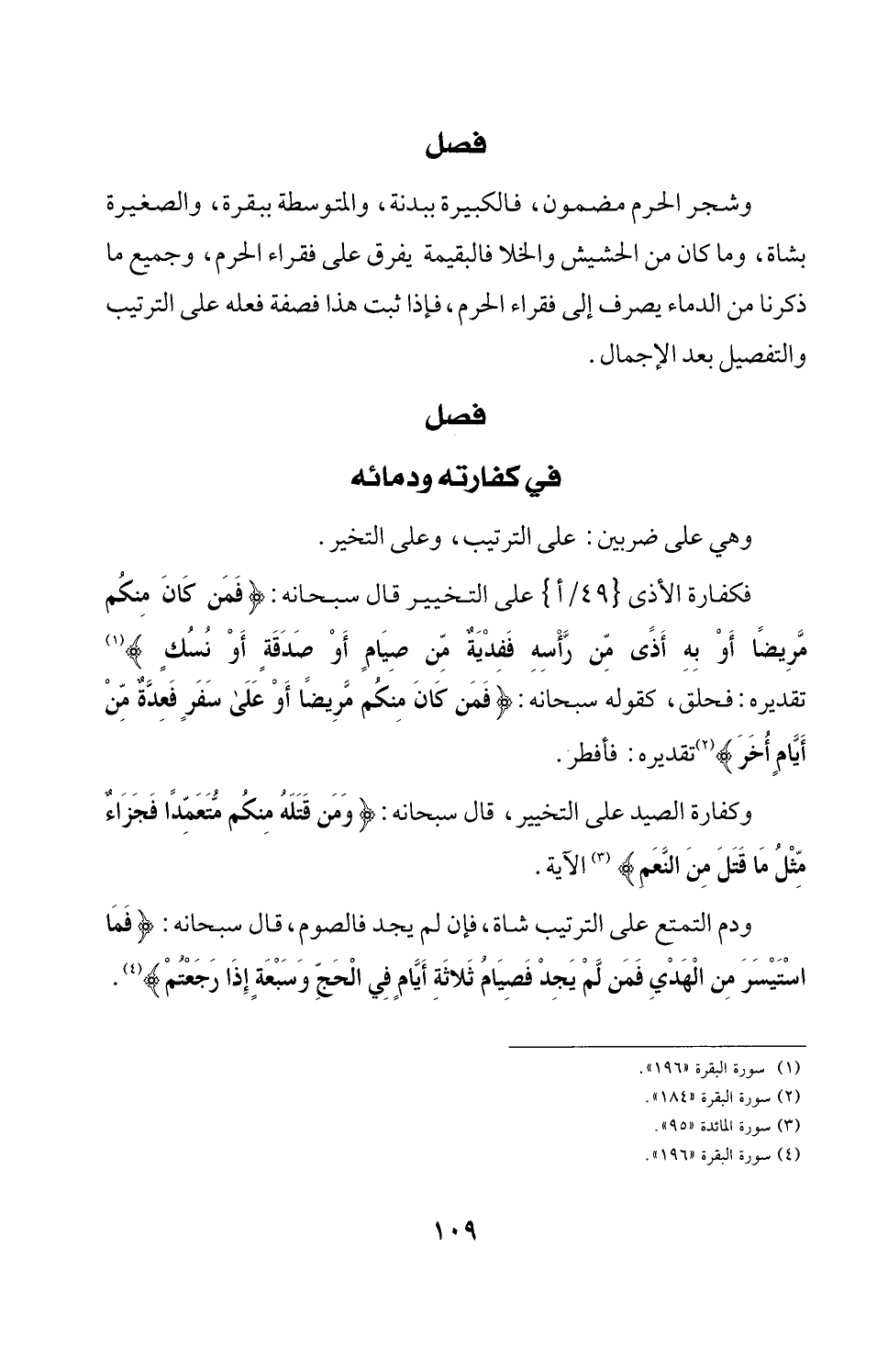 فكفارة الأذى {49/أ} على التخيير قال سبحانه: {فَمَنْ كَانَ مِنْكُمْ مَرِيضًا أَوْ بِهِ أَذًى مِنْ رَأْسِهِ فَفِدْيَةٌ مِنْ صِيَامٍ أَوْ صَدَقَةٍ أَوْ نُسُكٍ} (¬1) تقديره: فحلق، كقوله سبحانه: {فَمَنْ كَانَ مِنْكُمْ مَرِيضًا أَوْ عَلَى سَفَرٍ فَعِدَّةٌ مِنْ أَيَّامٍ أُخَرَ} (¬2) تقديره: فأفطر.