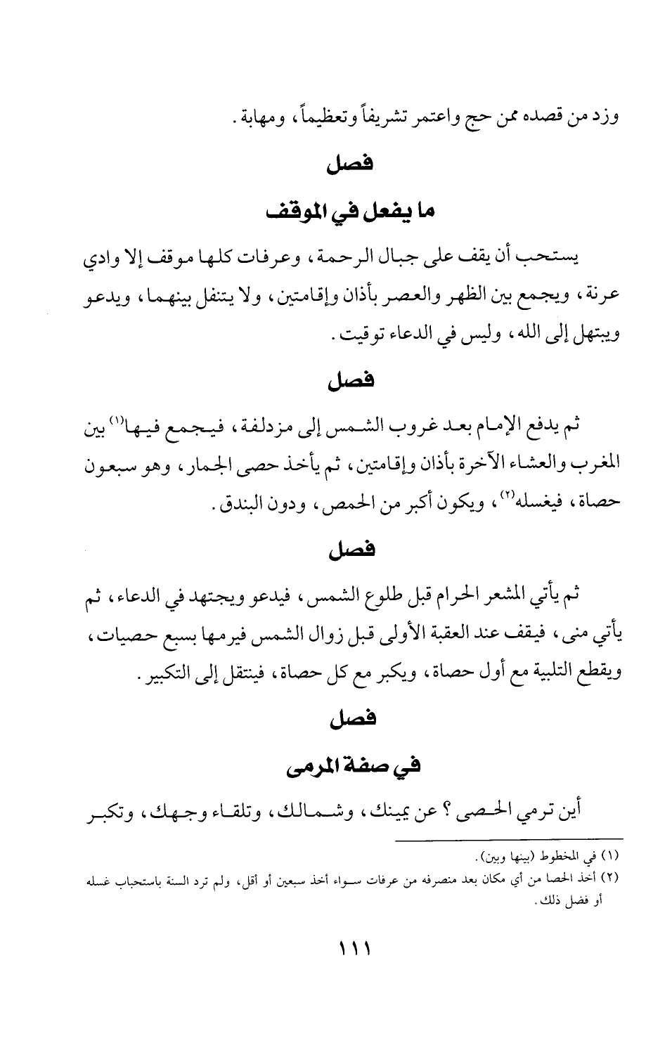 ثم يأتي المشعر الحرام قبل طلوع الشمس، فيدعو ويجتهد في الدعاء، ثم يأتي منى، فيقف عند العقبة الأولى قبل زوال الشمس فيرمها بسبع حصيات، ويقطع التلبية مع أول حصاة، ويكبر مع كل حصاة، فينتقل إلى التكبير.