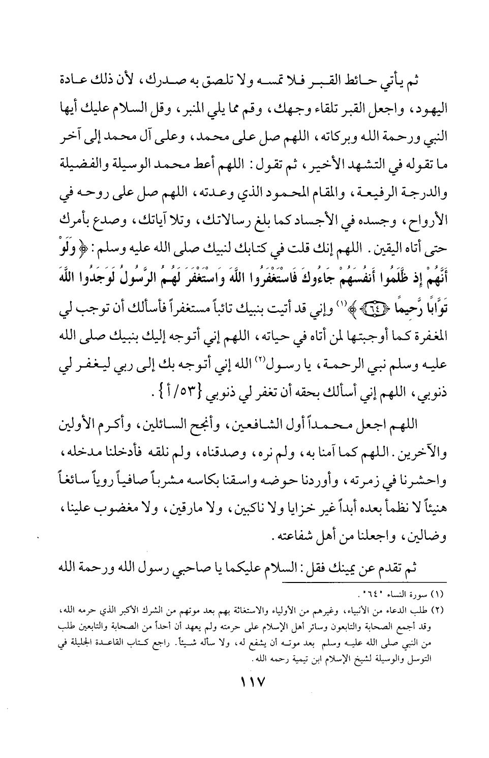 ثم يأتي حائط القبر فلا تمسه ولا تلصق به صدرك، لأن ذلك عادة اليهود، واجعل القبر تلقاء وجهك، وقم مما يلي المنبر، وقيل السلام عليك أيها النبي ورحمة الله وبركاته، اللهم صل على محمد، وعلى آل محمد إلى آخر ما تقوله في التشهد الأخير، ثم تقول: اللهم أعط محمد الوسيلة والفضيلة والدرجة الرفيعة، والمقام المحمود الذي وعدته، اللهم صل على روحه في الأرواح، وجسده في الأجساد كما بلغ رسالاتك، وتلا آياتك، وصدع بأمرك حتى أتاه اليقين. اللهم إنك قلت في كتابك لنبيك صلى الله عليه وسلم: {لَوْ أَنَهُمْ إذ ظَلَمُوا أَنفُسَهُمْ جَاءُوكَ فَاسْتَغْفَرُوا اللهَ وَاسْتَغْفَرَ لَهُمُ الرَّسُولُ لَوَجَدُوا اللهَ تَوَّابًا رَّحِيمًا (64)} (¬1) وإني قد أتيت بنبيك تائباً مستغفراً فأسألك أن توجب لي المغفرة كما أوجبتها لمن أتاه في حياته، اللهم إني أتوجه إليك بنبيك صلى الله عليه وسلم نبي الرحمة، يا رسول (¬2) الله إني أتوجه بك إلى ربي ليغفر لي ذنوبي، اللهم إني أسألك بحقه أن تغفر لي ذنوبي {35/أ}.