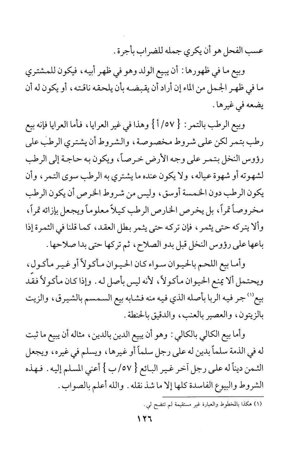 وأما بيع الكالي بالكالي: وهو أن يبيع الدين بالدين، مثاله أن يبيع ما تبت له في الذمة سلماً بدين له على رجل سلماً أو غيرها، ويسلم في غيره، ويجعل الثمن ديناً له على رجل آخر غير البائع {57/ب} أعني المسلم إليه. فهذه الشروط والبيوع الفاسدة كلها إلا ما شذ نقله. والله أعلم بالصواب.