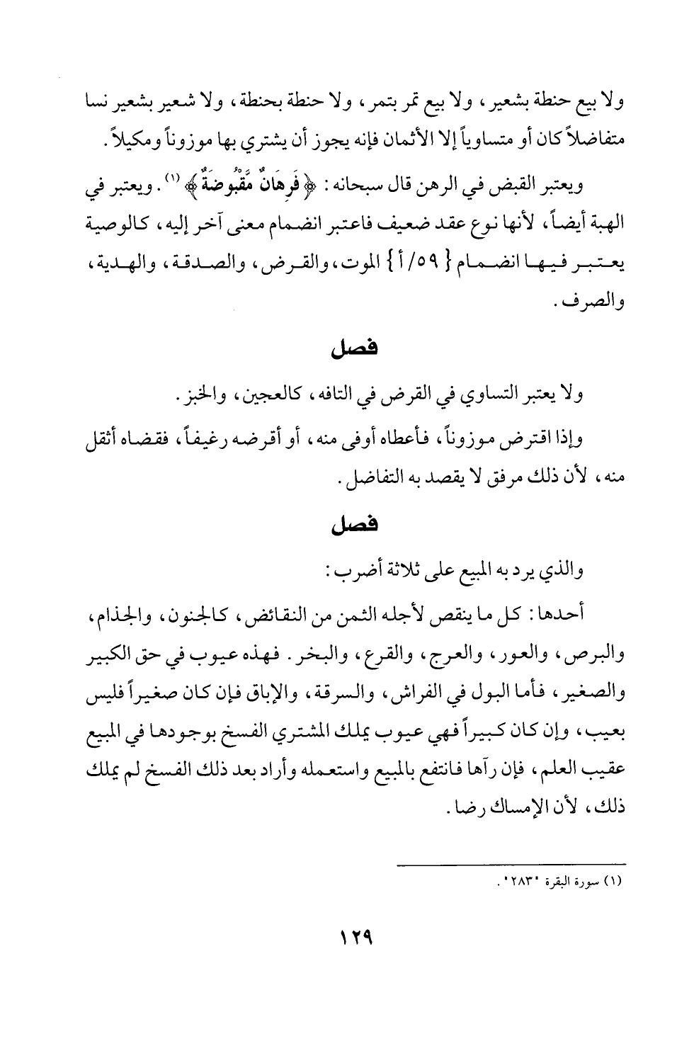 ويعتبر القبض في الرهن قال سبحانه: {فَرِهَانٌ مَّقْبُوضَةٌ} (¬1). ويعتبر في الهبة أيضاً, لأنها نوع عقد ضعيف فاعتبر انضمام معنى آخر إليه، كالوصية يعتبر فيها انضمام {59/أ} الموت، والقرض، والصدقة، والهدية، والصرف.
