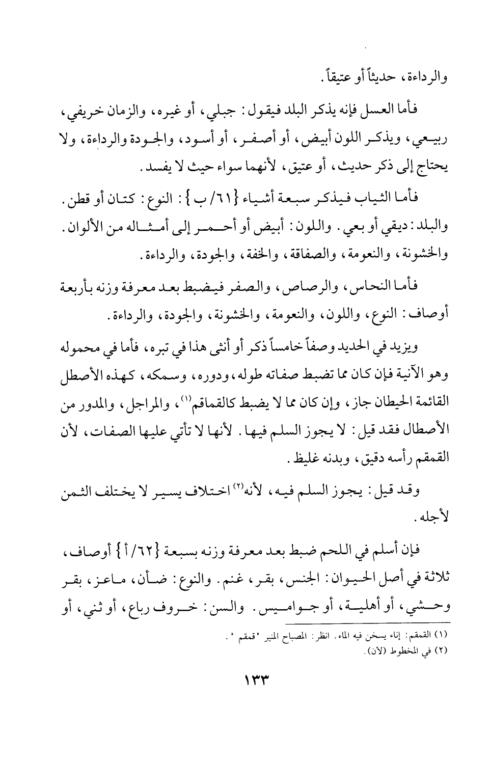 ويزيد في الحديد وصفاً خامساً ذكر أو أنثى هذا في تبره، فأما في محموله وهو الآنية فإن كان مما تضبط صفاته طوله، ودوره، وسمكه، كهذه الأصطل القائمة الحيطان جاز، وإن كان مما لا يضبط كالقماقم (¬1)، والمراجل، والمدور من الأصطال فقد قيل: لا يجوز السلم فيها. لأنها لا تأتي عليها الصفات، لأن القمقم رأسه دقيق، وبدنه غليظ.
