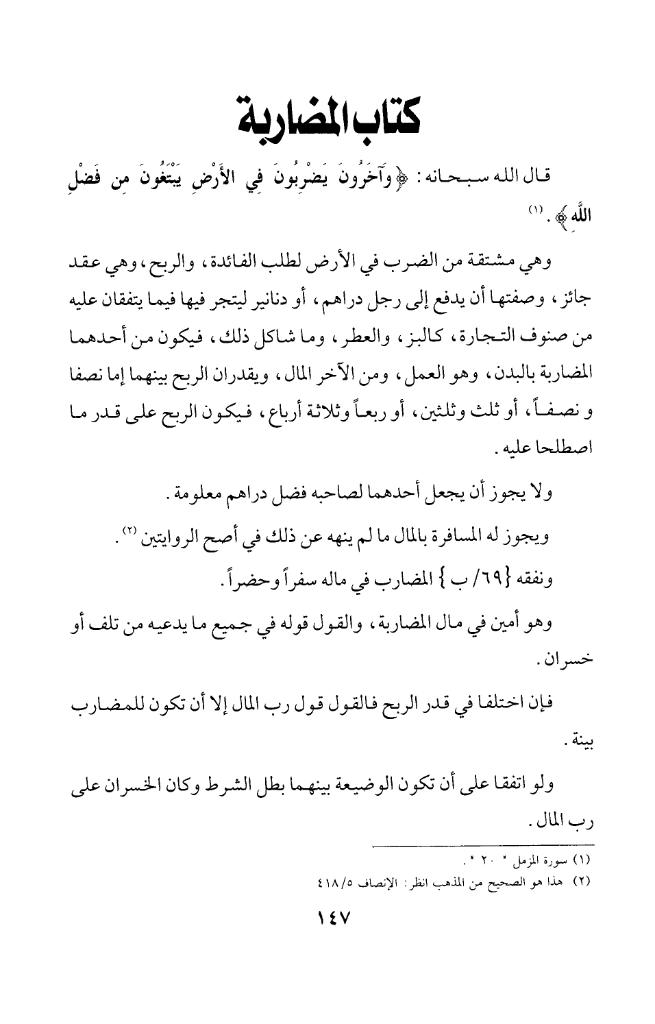 وهي مشتقة من الضرب في الأرض لطلب الفائدة، والربح، وهي عقد جائز، وصفتها أن يدفع إلى رجل دراهم، أو دنانير ليتجر فيها فيما يتفقان عليه من صنوف التجارة، كالبز، والعطر، وما شاكل ذلك، فيكون من أحدهما المضاربة بالبدن، وهو العمل، ومن الآخر المال، ويقدران الربح بينهما إما نصفا ونصفاً، أو ثلث وثلثين، أو ربعاً وثلاثة أرباع، فيكون الربح على قدر ما اصطلحا عليه.