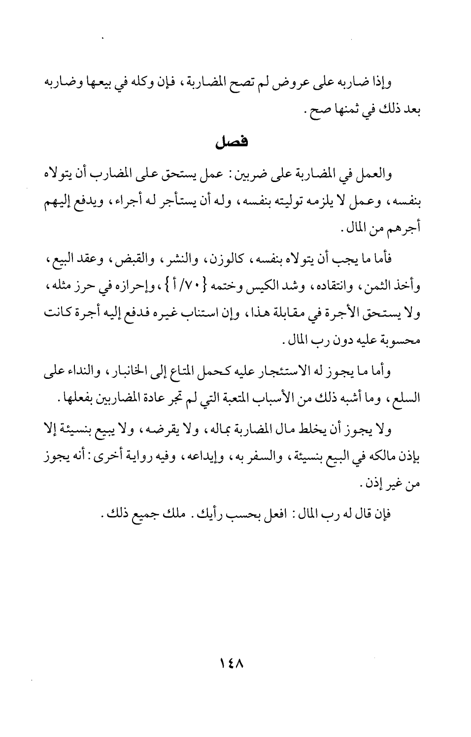 فأما ما يجب أن يتولاه بنفسه، كالوزن، والنشر، والقبض، وعقد البيع، وأخذ الثمن، وانتقاده، وشد الكيس وختمه {70/أ}، وإحرازه في حرز مثله، ولا يستحق الأجرة في مقابلة هذا، وإن استناب غيره فدفع إليه أجرة كانت محسوبة عليه دون رب المال.