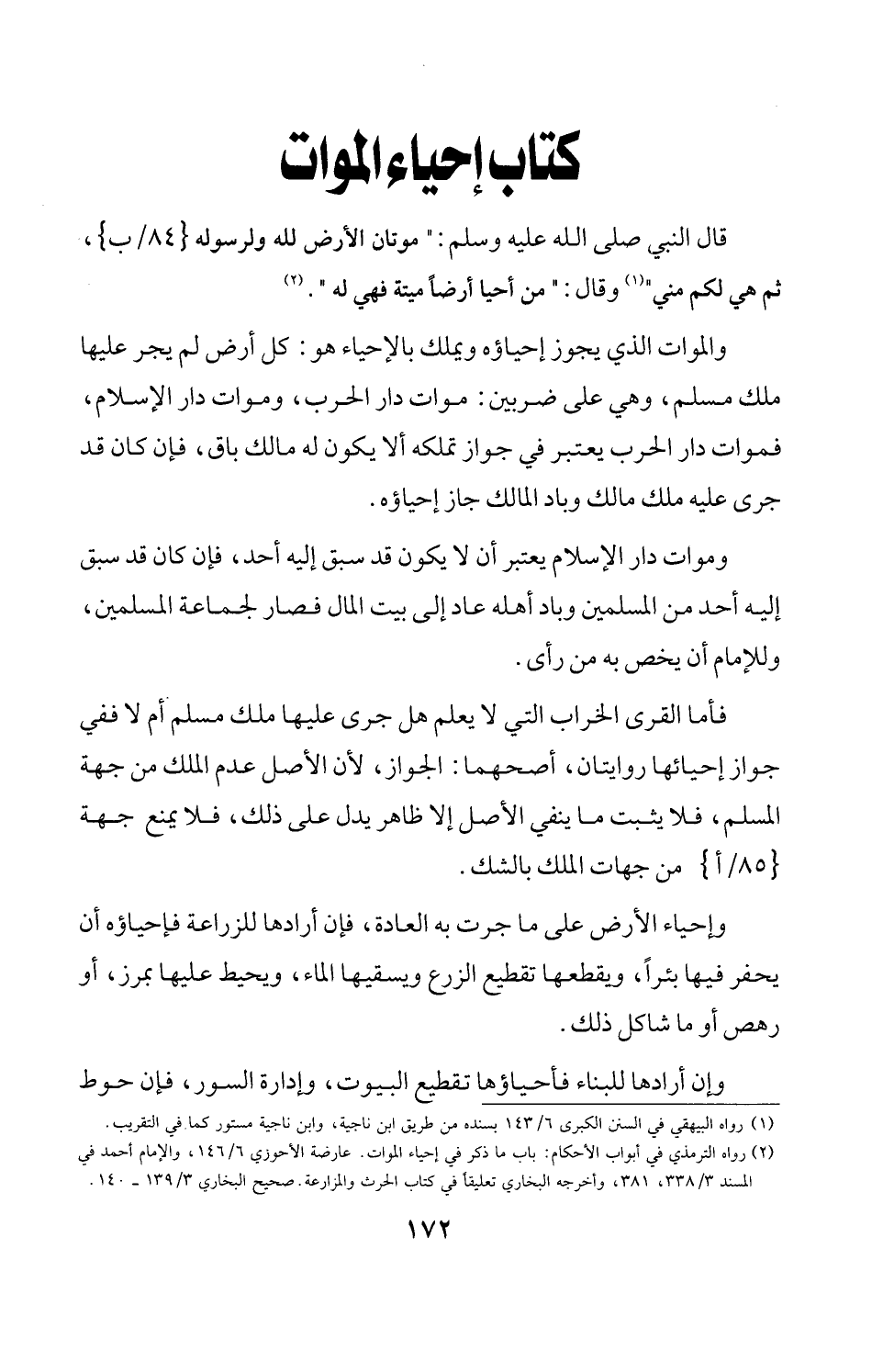 (¬2) رواه الترمذي في أبواب الأحكام: باب ما ذكر في إحياء الموات. عارضة الأحوزي 6/ 146، والإمام أحمد في المسند 3/ 338، 381، وأخرجه البخاري تعليقاً في كتاب الحرث والمزارعة. صحيح البخاري 3/ 139 - 140.