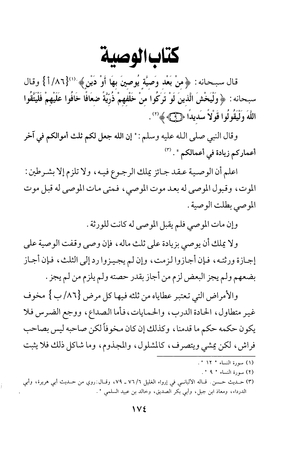 قال سبحانه: {مِنْ بَعْدِ وَصِيَّةٍ يُوصِي بِهَا أَوْ دَيْنٍ} (¬1) {86/ أ} وقال سبحانه: {وَلْيَخْشَ الَّذِينَ لَوْ تَرَكُوا مِنْ خَلْفِهِمْ ذُرِّيَّةً ضِعَافًا خَافُوا عَلَيْهِمْ فَلْيَتَّقُوا اللَّهَ وَلْيَقُولُوا قَوْلًا سَدِيدًا (9)} (¬2).