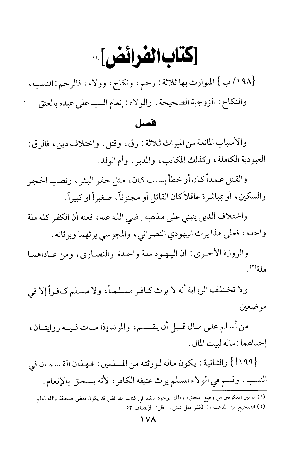 {198/ ب} المتوارث بها ثلاثة: رحم، ونكاح، وولاء، فالرحم: النسب، والنكاح: الزوجية الصحيحة. والولاء: إنعام السيد على عبده بالعتق.