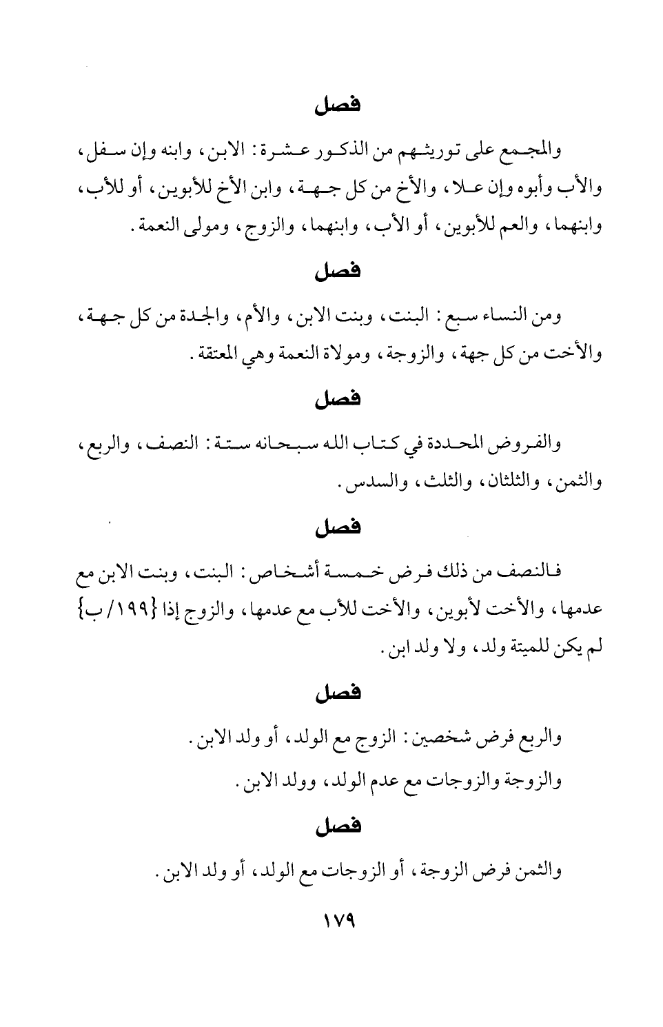 فالنصف من ذلك فرض خمسة أشخاص: البنت، وبنت الابن مع عدمها، والأخت لأبوين، والأخت للأب مع عدمها، والزوج إذا {199/ ب} لم يكن للميتة ولد، ولا ولد ابن.
