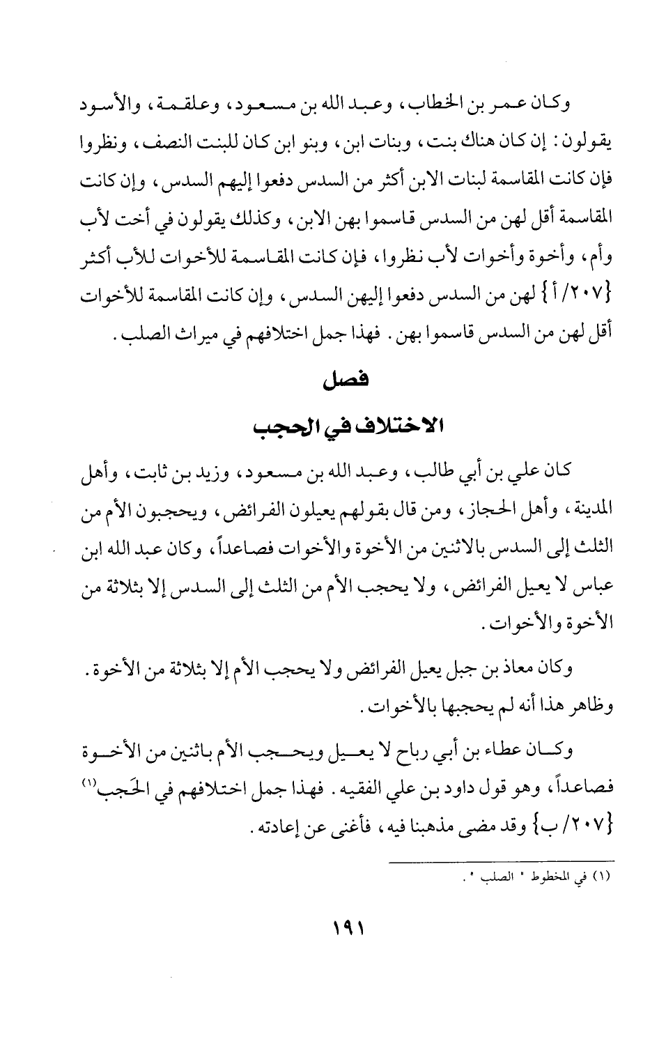 كان علي بن أبي طالب، وعبد الله بن مسعود، وزيد بن ثابت، وأهل المدينة، وأهل الحجاز، ومن قال بقولهم يعيلون الفرائض، ويحجبون الأم من الثلث إلى السدس بالاثنين من الأخوة والأخوات فصاعداً، وكان عبد الله ابن عباس لا يعيل الفرائض، ولا يحجب الأم من الثلث إلى السدس إلا بثلاثة من الأخوة والأخوات.