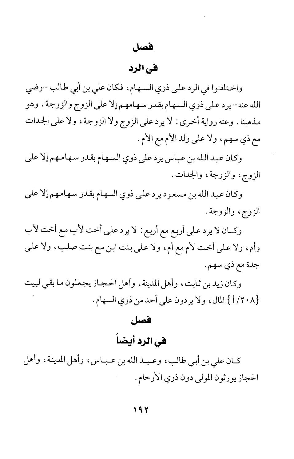 واختلفوا في الرد على ذوي السهام، فكان علي بن أبي طالب -رضي الله عنه- يرد على ذوي السهام بقدر سهامهم إلا على الزوج والزوجة. وهو مذهبنا. وعنه رواية أخرى: لا يرد على الزوج ولا الزوجة، ولا على الجدات مع ذي سهم، ولا على ولد الأم مع الأم.