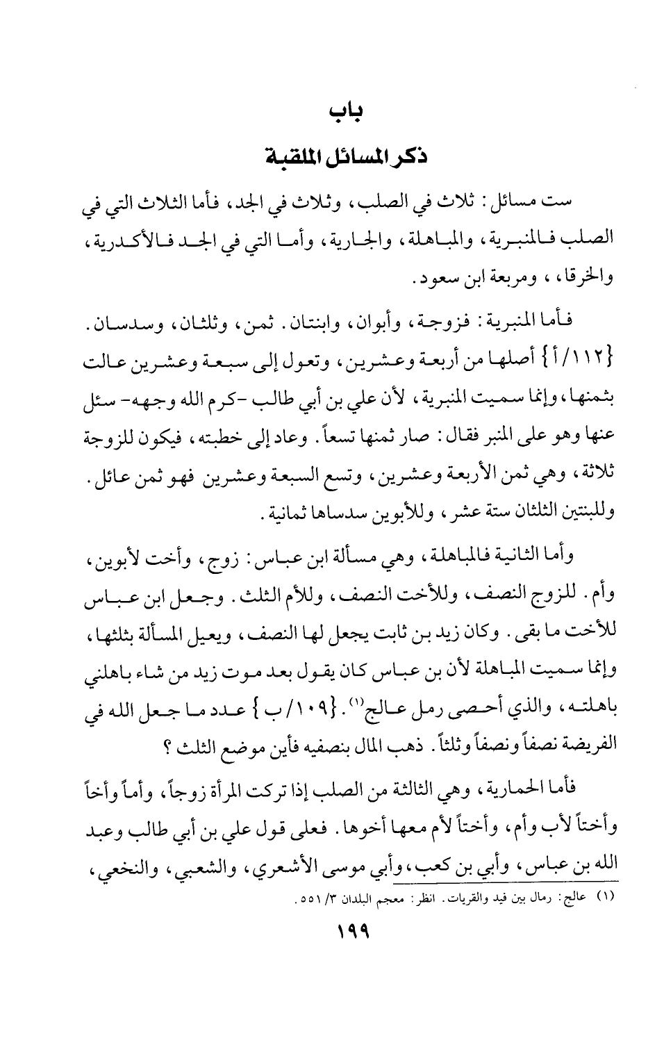 ست مسائل: ثلاث في الصلب، وثلاث في الجد، فأما الثلاث التي في الصلب فالمنبرية، والمباهلة، والجارية، وأما التي في الجد فالأكدرية، والخرقا، ، ومربعة ابن سعود.