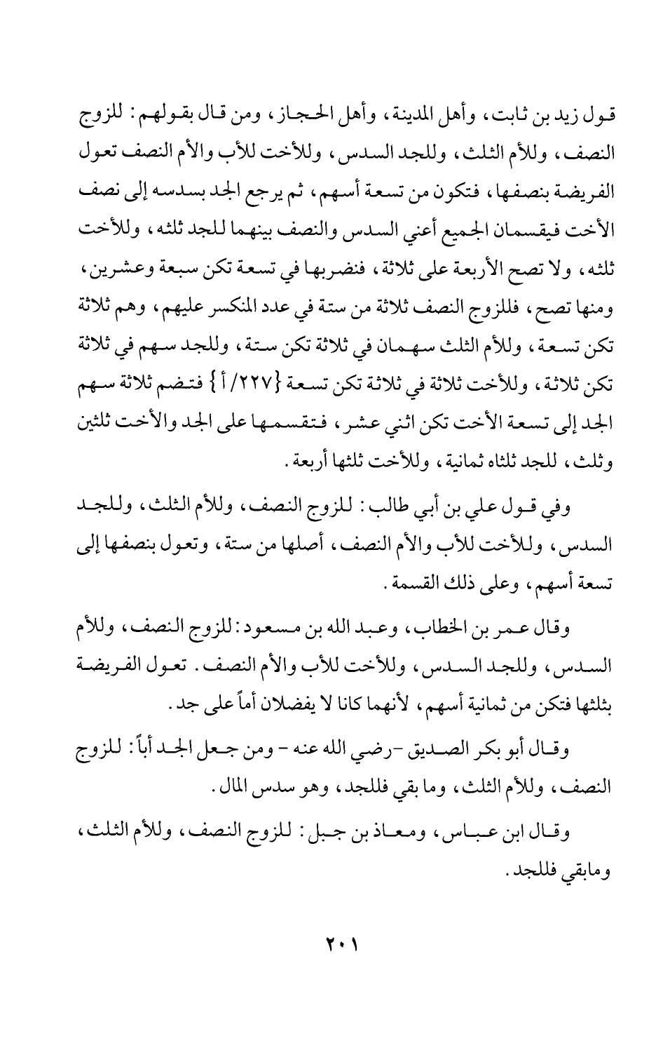 قول زيد بن ثابت، وأهل المدينة، وأهل الحجاز، ومن قال بقولهم: للزوج النصف، وللأم الثلث، وللجد السدس، وللأخت للأب والأم النصف تعول الفريضة بنصفها، فتكون من تسعة أسهم، ثم يرجع الجد بسدسه إلى نصف الأخت فيقسمان الجميع أعني السدس والنصف بينهما للجد ثلثه، وللأخت ثلثه، ولا تصح الأربعة على ثلاثة، فنضربها في تسعة تكن سبعة وعشرين، ومنها تصح، فللزوج النصف ثلاثة من ستة في عدد المنكسر عليهم، وهم ثلاثة تكن تسعة، وللأم الثلث سهمان في ثلاثة تكن ستة، وللجد سهم في ثلاثة تكن ثلاثة، وللأخت ثلاثة في ثلاثة تكن تسعة {227/ أ} فتضم ثلاثة سهم الجد إلى تسعة الأخت تكن اثني عشر، فتقسمها على الجد والأخت ثلثين وثلث، للجد ثلثاه ثمانية، وللأخت ثلثها أربعة.
