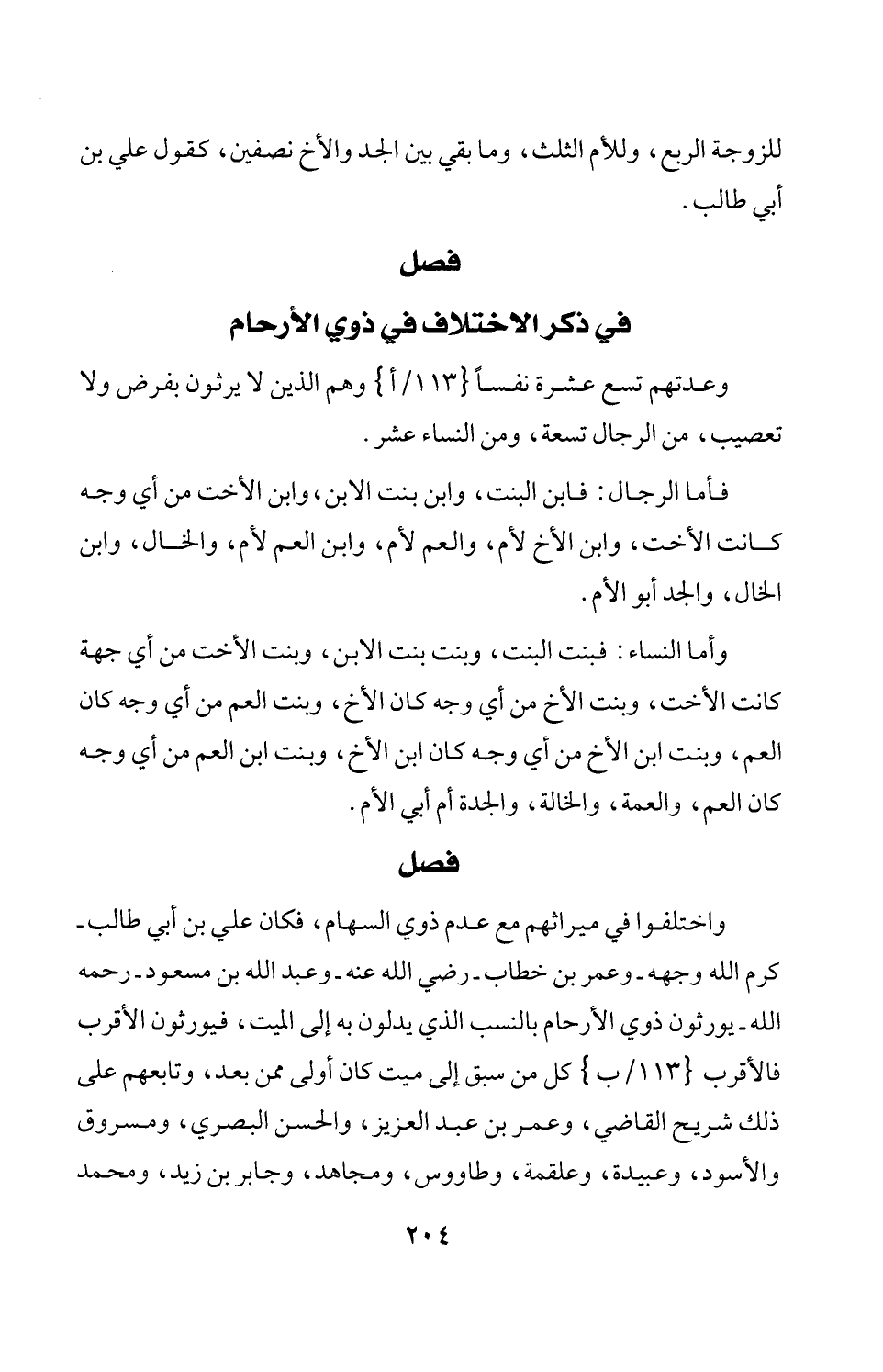 واختلفوا في ميراثهم مع عدم ذوي السهام، فكان علي بن أبي طالب -كرم الله وجهه- وعمر بن خطاب -رضي الله عنه- وعبد الله بن مسعود -رحمه الله- يورثون ذوي الأرحام بالنسب الذي يدلون به إلى الميت، فيورثون الأقرب فالأقرب {113/ ب} كل من سبق إلى ميت كان أولى ممن بعد، وتابعهم على ذلك شريح القاضي، وعمر بن عبد العزيز، والحسن البصري، ومسروق والأسود، وعبيدة، وعلقمة، وطاووس، ومجاهد، وجابر بن زيد، ومحمد