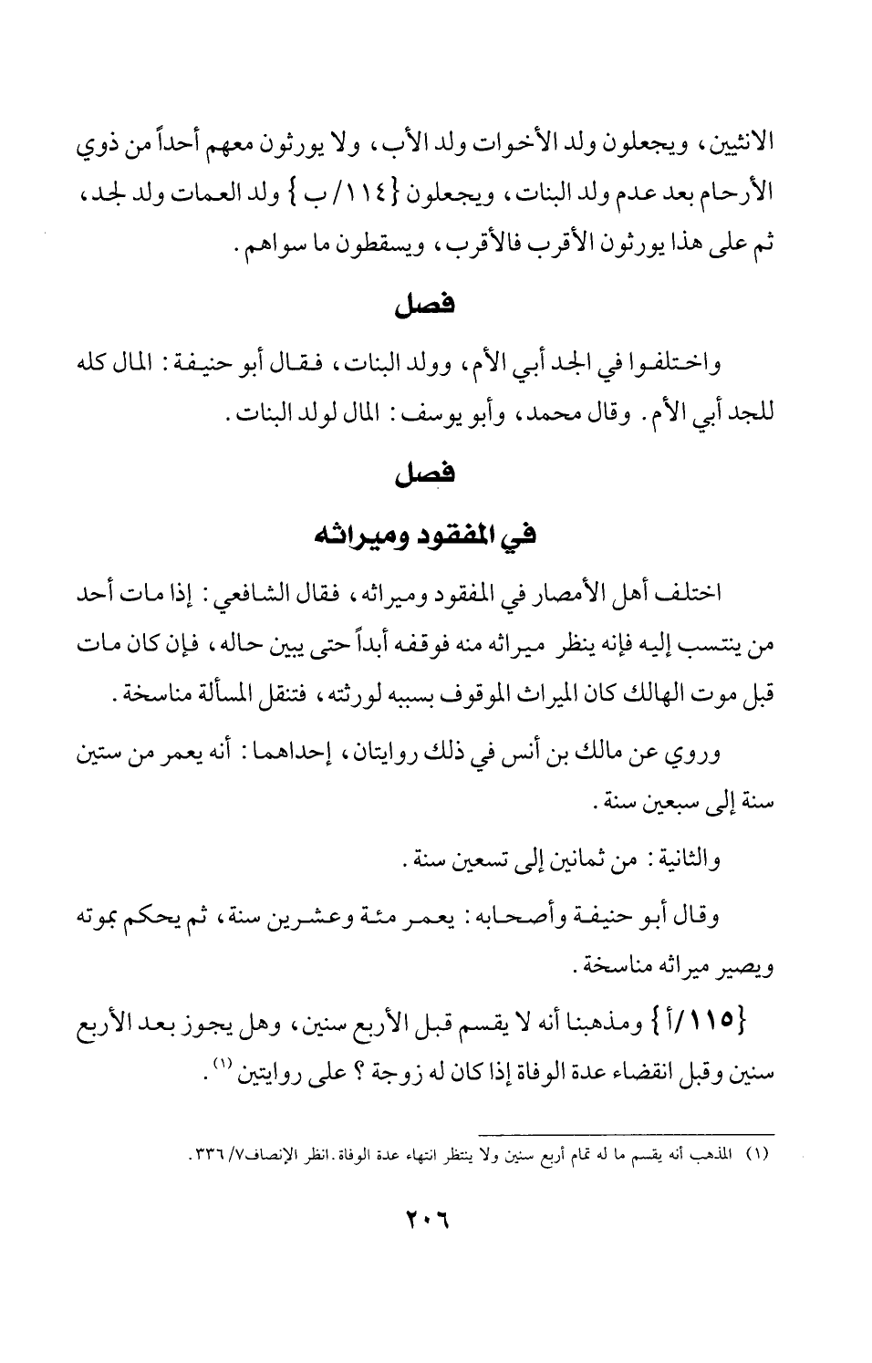 اختلف أهل الأمصار في المفقود وميراثه، فقال الشافعي: إذا مات أحد من ينتسب إليه فإنه ينظر ميراثه منه فوقفه أبداً حتى يبين حاله، فإن كان مات قبل موت الهالك كان الميراث الموقوف بسببه لورثته، فتنقل المسألة مناسخة.