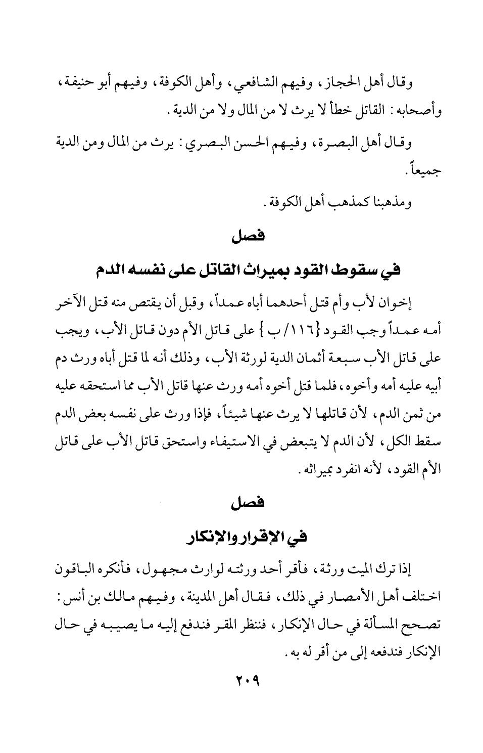 إخوان لأب وأم قتل أحدهما أباه عمداً، وقبل أن يقتص منه قتل الآخر أمه عمداً وجب القود {116/ ب} على قاتل الأم دون قاتل الأب، ويجب على قاتل الأب سبعة أثمان الدية لورثة الأب، وذلك أنه لما قتل أباه ورث دم أبيه عليه أمه وأخوه، فلما قتل أخوه أمه ورث عنها قاتل الأب مما استحقه عليه من ثمن الدم، لأن قاتلها لا يرث عنها شيئاً، فإذا ورث على نفسه بعض الدم سقط الكل، لأن الدم لا يتبعض في الاستيفاء واستحق قاتل الأب على قاتل الأم القود، لأنه انفرد بميراثه.