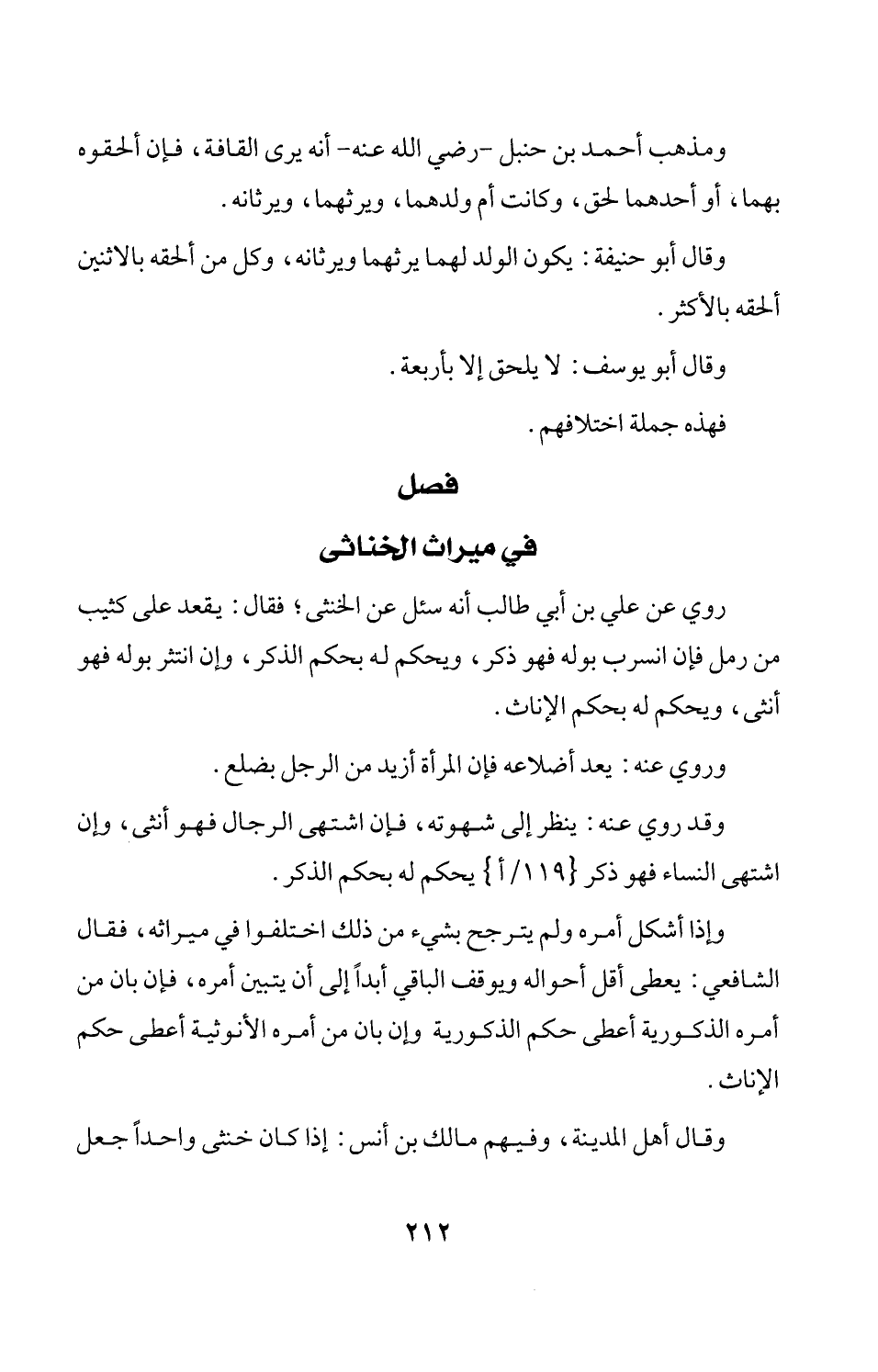 ومذهب أحمد بن حنبل -رضي الله عنه- أنه يرى القافة، فإن ألحقوه بهما، أو أحدهما لحق، وكانت أم ولدهما، ويرثهما، ويرثانه.
