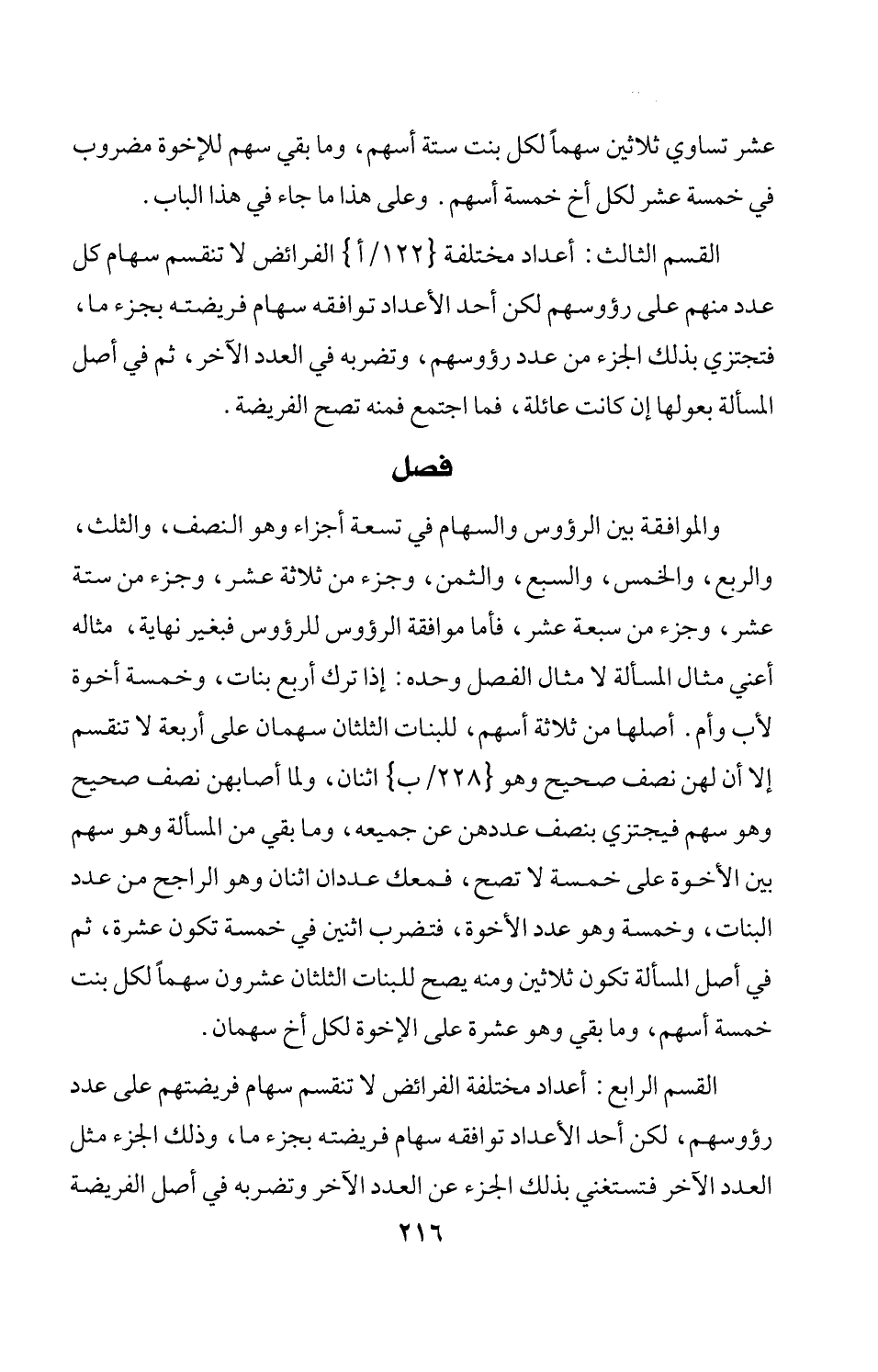 القسم الثالث: أعداد مختلفة {122/ أ} الفرائض لا تنقسم سهام كل عدد منهم على رؤوسهم لكن أحد الأعداد توافقه سهام فريضته بجزء ما، فتجتزي بذلك الجزء من عدد رؤوسهم، وتضربه في العدد الآخر، ثم في أصل المسألة بعولها إن كانت عائلة، فما اجتمع فمنه تصح الفريضة.