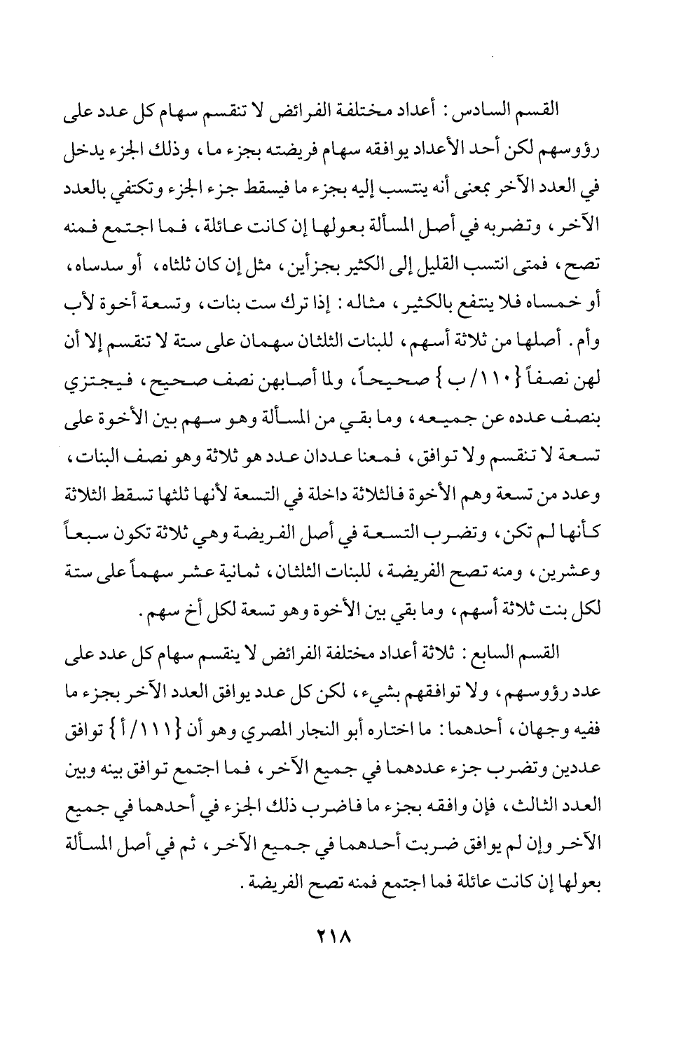 القسم السادس: أعداد مختلفة الفرائض لا تنقسم سهام كل عدد على رؤوسهم لكن أحد الأعداد يوافقه سهام فريضته بجزء ما، وذلك الجزء يدخل في العدد الآخر بمعنى أنه ينتسب إليه بجزء ما فيسقط جزء الجزء وتكتفي بالعدد الآخر، وتضربه في أصل المسألة بعولها إن كانت عائلة، فما اجتمع فمنه تصح، فمتى انتسب القليل إلى الكثير بجزأين، مثل إن كان ثلثاه، أو سدساه، أو خمساه فلا ينتفع بالكثير، مثاله: إذا ترك ست بنات، وتسعة أخوة لأب وأم. أصلها من ثلاثة أسهم، للبنات الثلثان سهمان على ستة لا تنقسم إلا أن لهن نصفاً {110/ ب} صحيحاً، ولما أصابهن نصف صحيح، فيجتزي بنصف عدده عن جميعه، وما بقي من المسألة وهو سهم بين الأخوة على تسعة لا تنقسم ولا توافق، فمعنا عددان عدد هو ثلاثة وهو نصف البنات، وعدد من تسعة وهم الأخوة فالثلاثة داخلة في التسعة لأنها ثلثها تسقط الثلاثة كأنها لم تكن، وتضرب التسعة في أصل الفريضة وهي ثلاثة تكون سبعاً وعشرين، ومنه تصح الفريضة، للبنات الثلثان، ثمانية عشر سهماً على ستة لكل بنت ثلاثة أسهم، وما بقي بين الأخوة وهو تسعة لكل أخ سهم.