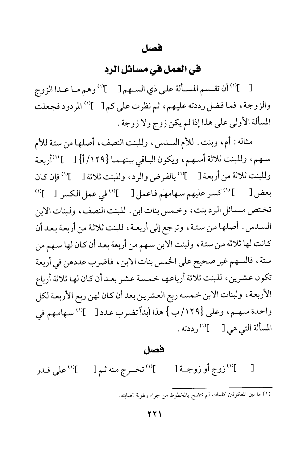 مثاله: أم، وبنت. للأم السدس، وللبنت النصف، أصلها من ستة للأم سهم، وللبنت ثلاثة أسهم، ويكون الباقي بينهما {129/ أ} [] (1) أربعة وللبنت ثلاثة من أربعة [] (1) بالفرض والرد، وللبنت ثلاثة [] (1) فإن كان بعض [] (1) كسر عليهم سهامهم فاعمل [] (1) في عمل الكسر [] (1) تختص مسائل الرد بنت، وخمس بنات ابن. للبنت النصف، ولبنات الابن السدس. أصلها من ستة، وترجع إلى أربعة، للبنت ثلاثة من أربعة بعد أن كانت لها ثلاثة من ستة، ولبنت الابن سهم من أربعة بعد أن كان لها سهم من ستة، فالسهم غير صحيح على الخمس بنات الابن، فاضرب عددهن في أربعة تكون عشرين، للبنت ثلاثة أرباعها خمسة عشر بعد أن كان لها ثلاثة أرباع الأربعة، ولبنات الابن خمسه ربع العشرين بعد أن كان لهن ربع الأربعة لكل واحدة سهم، وعلى {129/ ب} هذا أبداً تضرب عدد [] (1) سهامهم في المسألة التي هي [] (1) رددته.