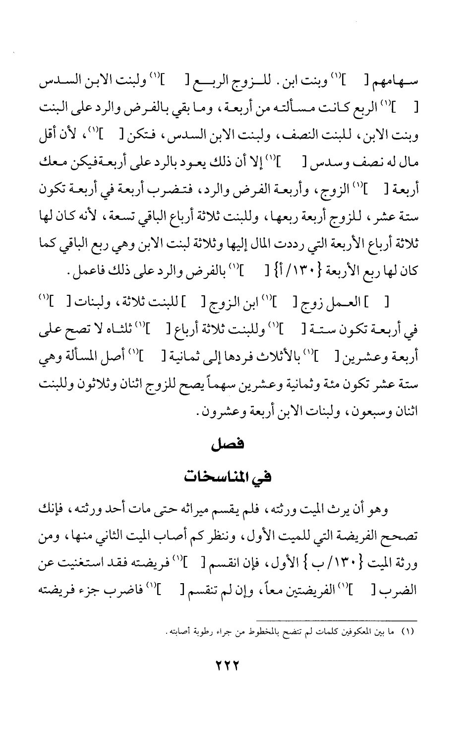[] العمل زوج [] (1) ابن الزوج [] للبنت ثلاثة، ولبنات [] (1) في أربعة تكون ستة [] (1) وللبنت ثلاثة أرباع [] (1) ثلثاه لا تصح على أربعة وعشرين [] (1) بالأثلاث فردها إلى ثمانية [] (1) أصل المسألة وهي ستة عشر تكون مئة وثمانية وعشرين سهماً يصح للزوج اثنان وتلاثون وللبنت اثنان وسبعون، ولبنات الابن أربعة وعشرون.