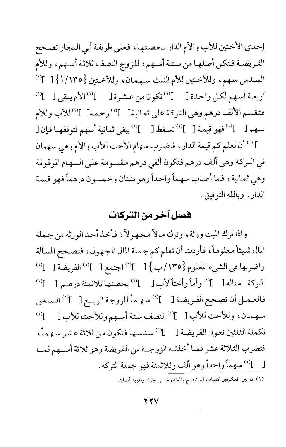 وإذا ترك الميت ورثة، وترك مالاً مجهولاً، فأخذ أحد الورثة من جملة المال شيئاً معلوماً، فأردت أن تعلم كم جملة المال المجهول، فتصحح المسألة واضربها في الشيء المعلوم {135/ ب} [] (1) اجتمع [] (1) الفريضة [] (1) التركة. مثاله [] (1) وأماً وأختاً لأب [] (1) بحصتها ثلاثمئة درهم [] (1) فالعمل أن تصحح الفريضة [] (1) سهماً للزوجة الربع [] (1) السدس سهمان، وللأخت للأب [] (1) النصف ستة أسهم وللأخت للأب [] (1) تكملة الثلثين تعول الفريضة [] (1) سدسها فتكون من ثلاثة عشر سهماً، فتضرب الثلاثة عشر فما أخذته الزوجة من الفريضة وهو ثلاثة أسهم فما [] (¬1) سهماً واحداً وهو ألف وثلاثمئة فهو جملة التركة.