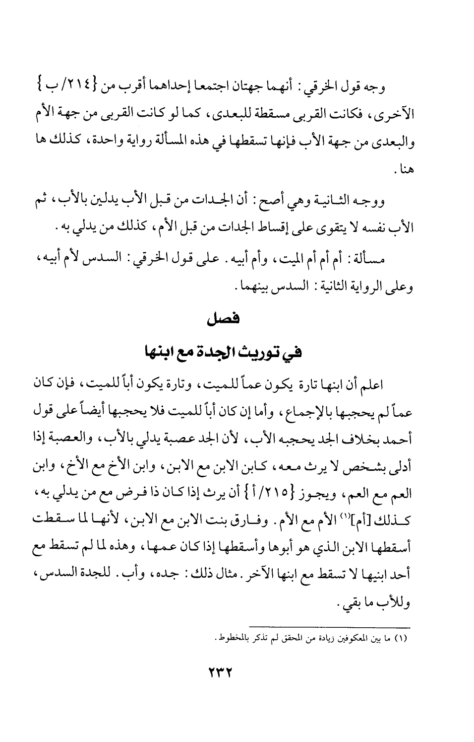 اعلم أن ابنها تارة يكون عماً للميت، وتارة يكون أباً للميت، فإن كان عماً لم يحجبها بالإجماع، وأما إن كان أباً للميت فلا يحجبها أيضاً على قول أحمد بخلاف الجد يحجبه الأب، لأن الجد عصبة يدلي بالأب، والعصبة إذا أدلى بشخص لا يرث معه، كابن الابن مع الابن، وابن الأخ مع الأخ، وابن العم مع العم، ويجوز {215/ أ} أن يرث إذا كان ذا فرض مع من يدلي به، كذلك [أم] (¬1) الأم مع الأم. وفارق بنت الابن مع الابن، لأنها لما سقطت أسقطها الابن الذي هو أبوها وأسقطها إذا كان عمها، وهذه لما لم تسقط مع أحد ابنيها لا تسقط مع ابنها الآخر. مثال ذلك: جده، وأب. للجدة السدس، وللأب ما بقي.