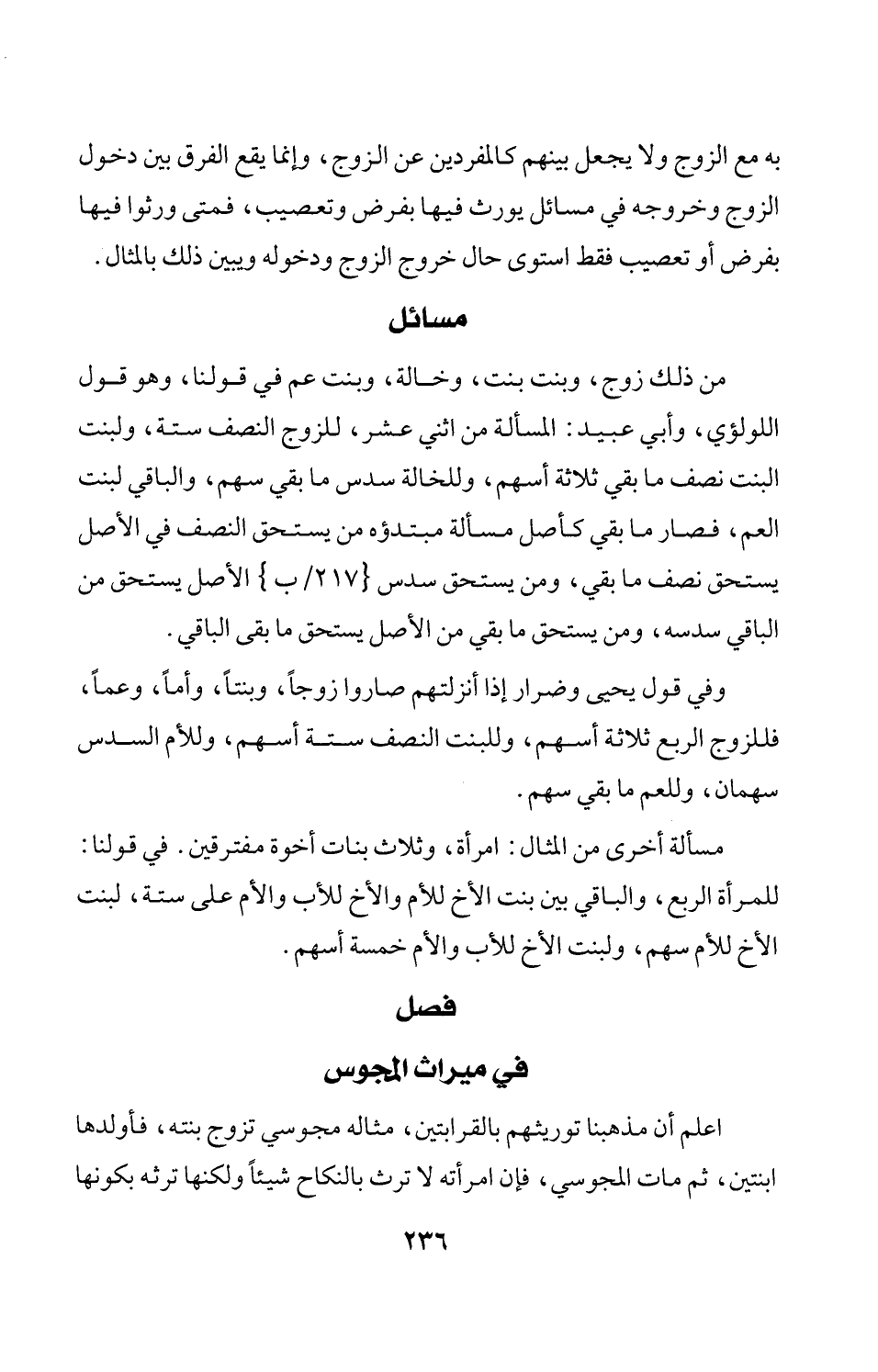من ذلك زوج، وبنت بنت، وخالة، وبنت عم في قولنا، وهو قول اللولؤي، وأبي عبيد: المسألة من اثني عشر، للزوج النصف ستة، ولبنت البنت نصف ما بقي ثلاثة أسهم، وللخالة سدس ما بقي سهم، والباقي لبنت العم، فصار ما بقي كأصل مسألة مبتدؤه من يستحق النصف في الأصل يستحق نصف ما بقي، ومن يستحق سدس {217/ ب} الأصل يستحق من الباقي سدسه، ومن يستحق ما بقي من الأصل يستحق ما بقى الباقي.