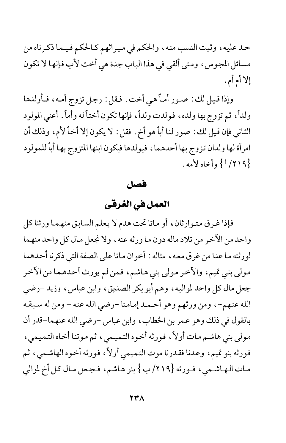 وإذا قيل لك: صور أماً هي أخت. فقل: رجل تزوج أمه، فأولدها ولداً، ثم تزوج بها ولده، فولدت ولداً، فإنها تكون أختاً له وأماً. أعني المولود الثاني فإن قيل لك: صور لنا أباً هو أخ. فقل: لا يكون إلا أخاً لأم، وذلك أن امرأة لها ولدان تزوج بها أحدهما، فيولدها فيكون ابنها المتزوج بها أباً للمولود {219/ أ} وأخاه لأمه.