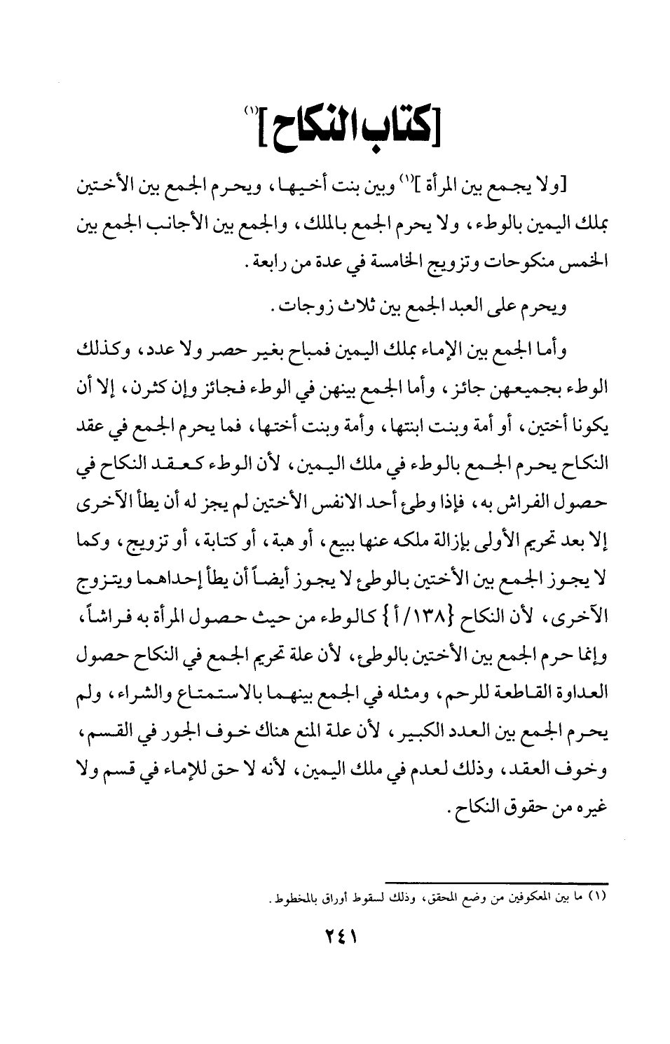 وأما الجمع بين الإماء بملك اليمين فمباح بغير حصر ولا عدد، وكذلك الوطء بجميعهن جائز، وأما الجمع بينهن في الوطء فجائز وإن كثرن، إلا أن يكونا أختين، أو أمة وبنت ابنتها، وأمة وبنت أختها، فما يحرم الجمع في عقد النكاح يحرم الجمع بالوطء في ملك اليمين، لأن الوطء كعقد النكاح في حصول الفراش به، فإذا وطئ أحد الانفس الأختين لم يجز له أن يطأ الآخرى إلا بعد تحريم الأولى بإزالة ملكه عنها ببيع، أو هبة، أو كتابة، أو تزويج، وكما لا يجوز الجمع بين الأختين بالوطئ لا يجوز أيضاً أن يطأ إحداهما ويتزوج الآخرى، لأن النكاح {138/ أ} كالوطء من حيث حصول المرأة به فراشاً، وإنما حرم الجمع بين الأختين بالوطئ، لأن علة تحريم الجمع في النكاح حصول العداوة القاطعة للرحم، ومثله في الجمع بينهما بالاستمتاع والشراء، ولم يحرم الجمع بين العدد الكبير، لأن علة المنع هناك خوف الجور في القسم، وخوف العقد، وذلك لعدم في ملك اليمين، لأنه لا حق للإماء في قسم ولا غيره من حقوق النكاح.