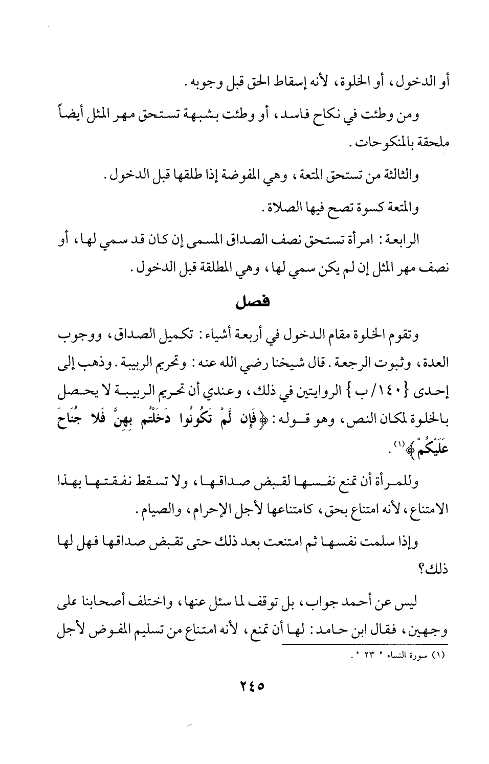 وتقوم الخلوة مقام الدخول في أربعة أشياء: تكميل الصداف، ووجوب العدة، وثبوت الرجعة. قال شيخنا رضي الله عنه: وتحريم الربيبة. وذهب إلى إحدى {140/ ب} الروايتين في ذلك، وعندي أن تحريم الربيبة لا يحصل بالخلوة لمكان النص، وهو قوله: {فَإِنْ لَمْ تَكُونُوا دَخَلْتُمْ بِهِنَّ فَلَا جُنَاحَ عَلَيْكُمْ} (¬1).