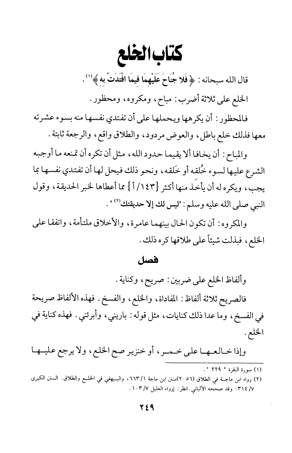 (¬2) رواه ابن ماجة في الطلاق (2056) سنن ابن ماجة 1/ 663، والبيهقي في الخلع والطلاق. السنن الكبرى 7/ 314: وقد صححه الألباني. انظر: إرواء الغليل 7/ 103.