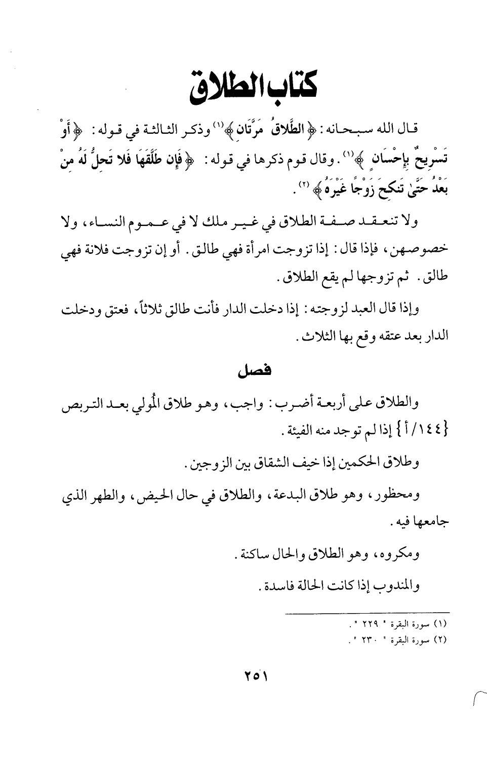 والطلاق على أربعة أضرب: واجب، وهو طلاق المُولي بعد التربص {144/أ} إذا لم توجد منه الفيئة.