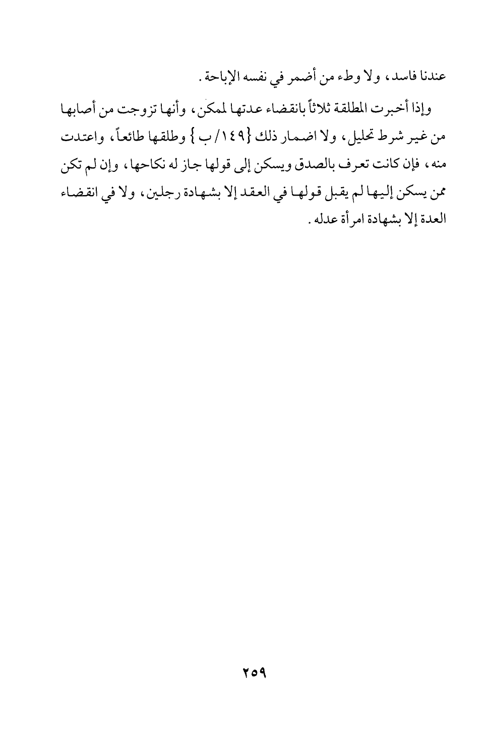 وإذا أخبرت المطلقة ثلاثاً بانقضاء عدتها لمكن، وأنها تزوجت من أصابها من غير شرط تحليل، ولا اضمار ذلك {149/ب} وطلقها طائعاً، واعتدت منه، فإن كانت تعرف بالصدق ويسكن إلى قولها جاز له نكاحها، وإن لم تكن ممن يسكن إليها لم يقبل قولها في العقد إلا بشهادة رجلين، ولا في انقضاء العدة إلا بشهادة امرأة عدله.