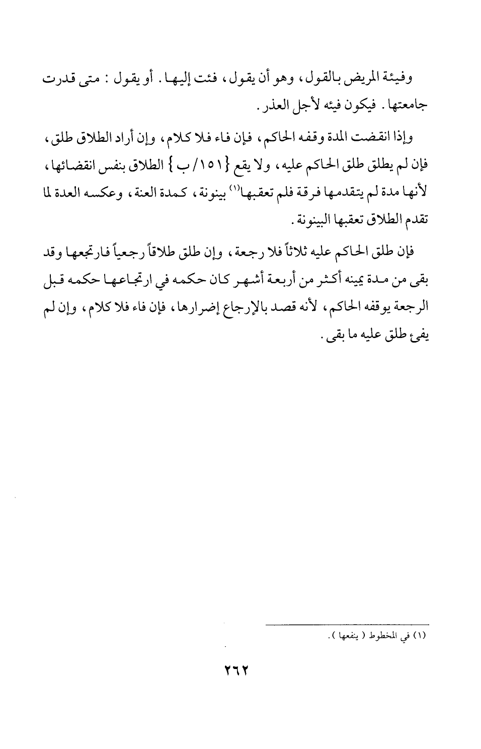 وفيئة المريض بالقول، وهو أن يقول، فئت إليها. أو يقول: متى قدرت جامعتها. فيكون فيئه لأجل العذر.
