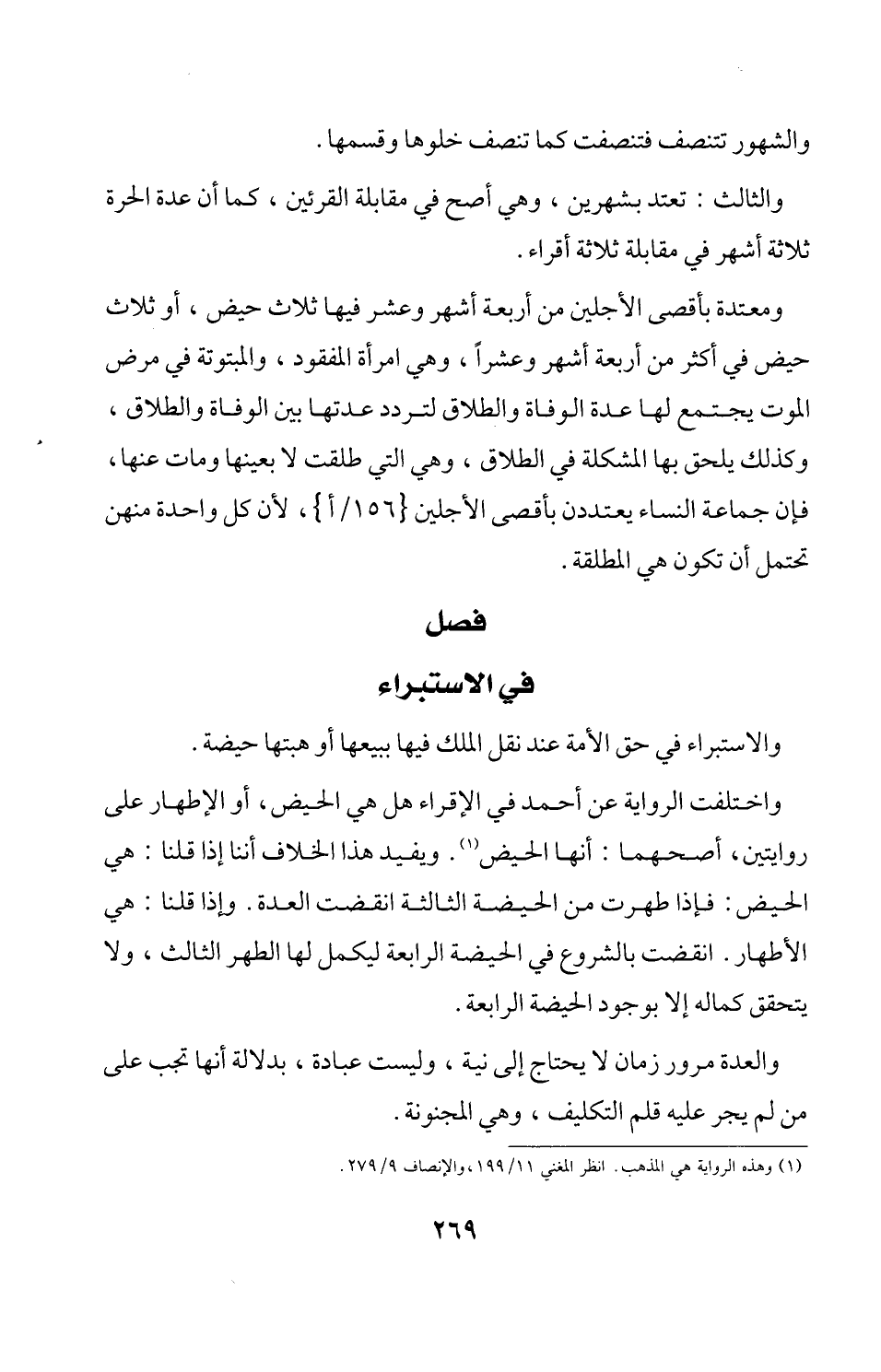 واختلفت الرواية عن أحمد في الإقراء هل هي الحيض، أو الإطهار على روايتين، أصحهما: أنها الحيض (¬1). ويفيد هذا الخلاف أننا إذا قلنا: هي الحيض: فإذا طهرت من الحيضة الثالثة انقضت العدة. وإذا قلنا: هي الأطهار. انقضت بالشروع في الحيضة الرابعة ليكمل لها الطهر الثالث، ولا يتحقق كماله إلا بوجود الحيضة الرابعة.