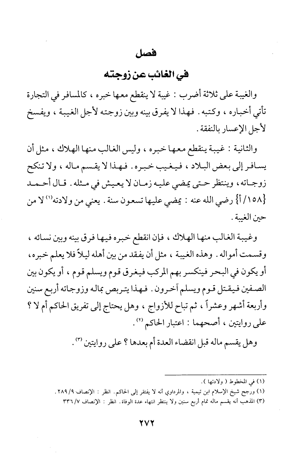 (¬3) المذهب أنه يقسم ماله تمام أربع سنين ولا ينتظر انتهاء عدة الوفاة. انظر: الإنصاف 7/ 336.
