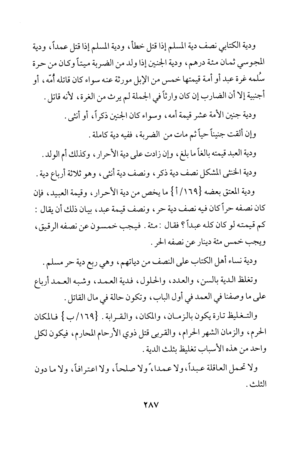 ودية الكتابي نصف دية المسلم إذا قتل خطأ، ودية المسلم إذا قتل عمداً، ودية المجوسي ثمان مئة درهم، ودية الجنين إذا ولد من الضربة ميتاً وكان من حرة سُلمه غرة عبد أو أمة قيمتها خمس من الإبل مورثة عنه سواء كان قاتله أُمّه، أو أجنبية إلا أن الضارب إن كان وارثاً في الجملة لم يرث من الغرة، لأنه قاتل.